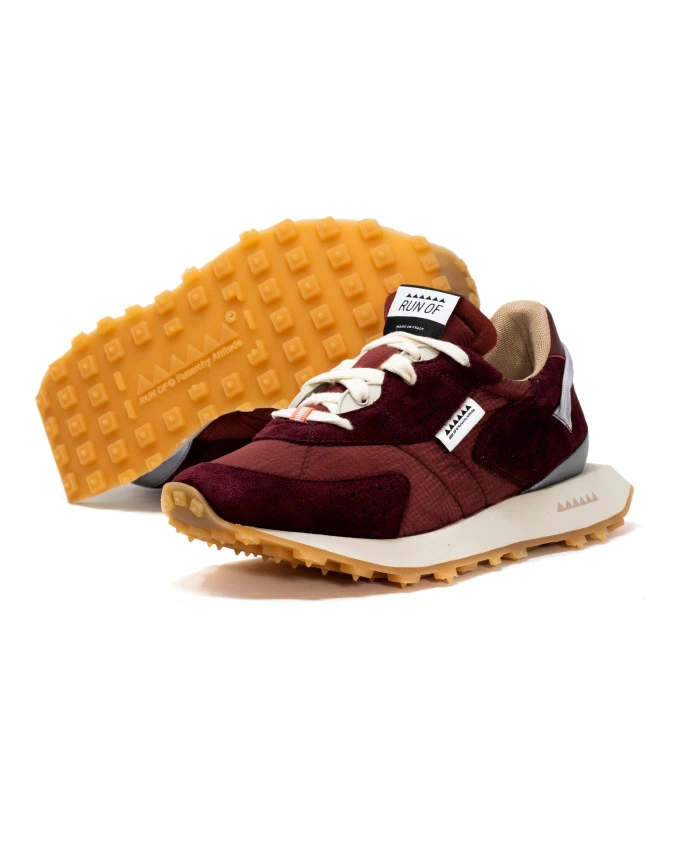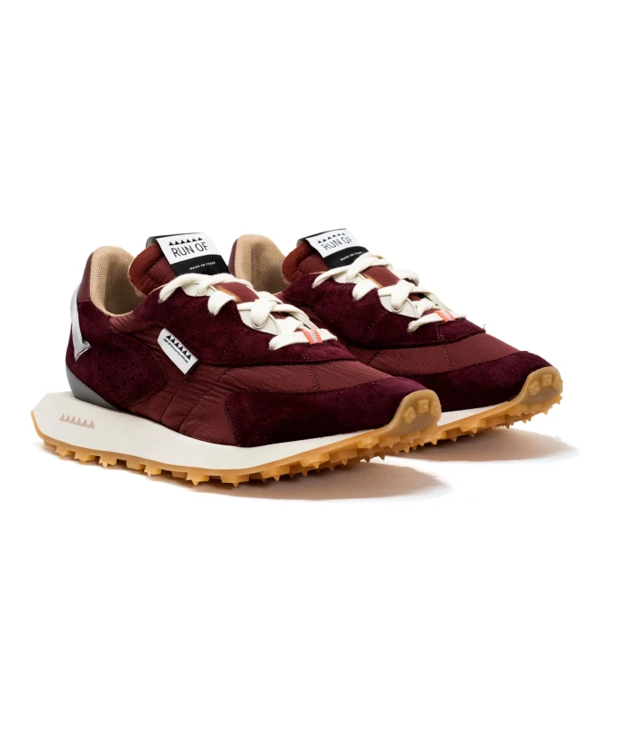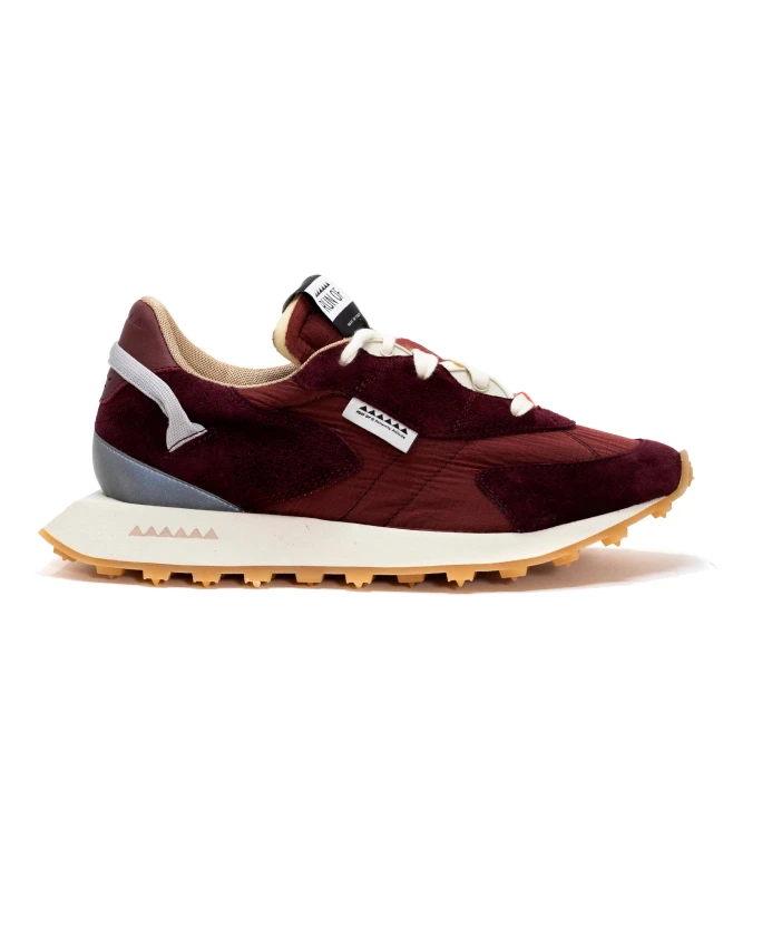 Кроссовки из бордовой натуральной кожи и темно-красной синтетической ткани с бело-медовой подошвой. Сделано в Италии.