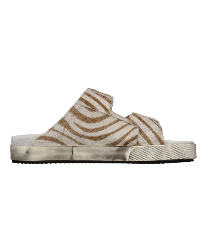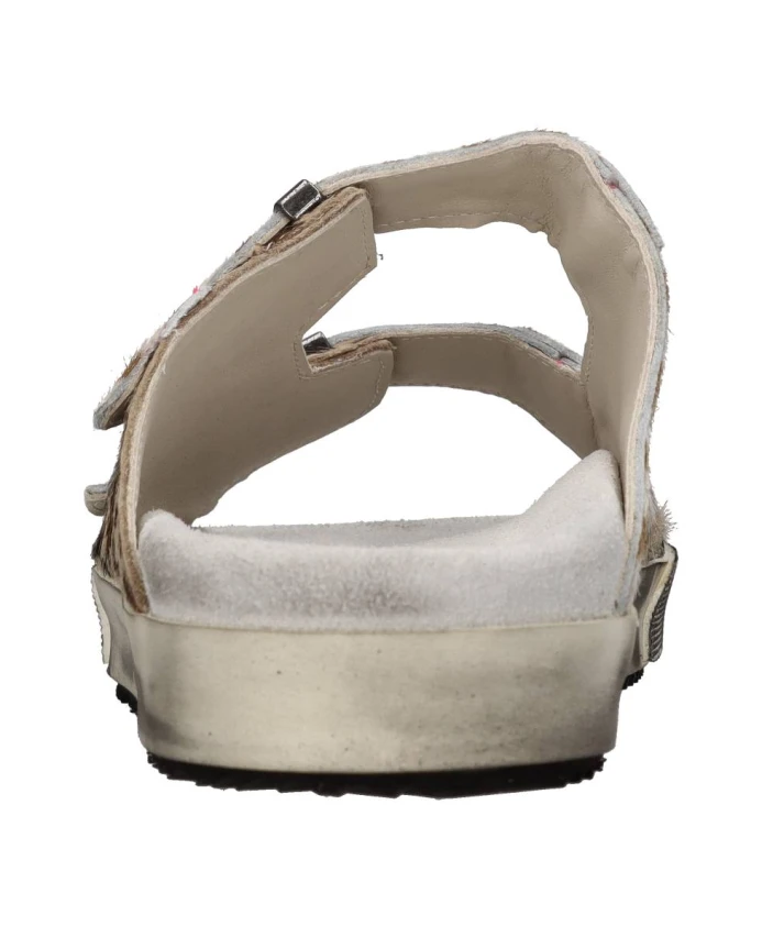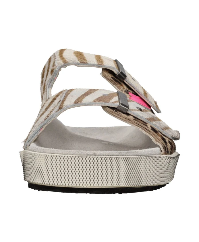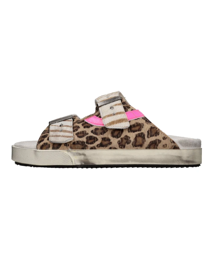 Женские мюли Hidnander Cavallino с резиновой подошвой и кожаным верхом, украшенные розовыми флуоресцентными деталями.