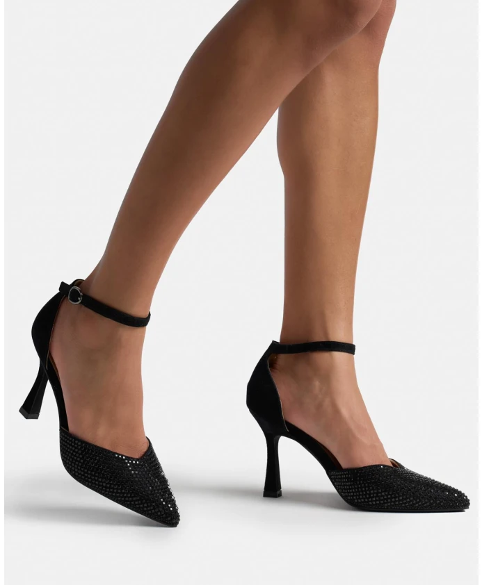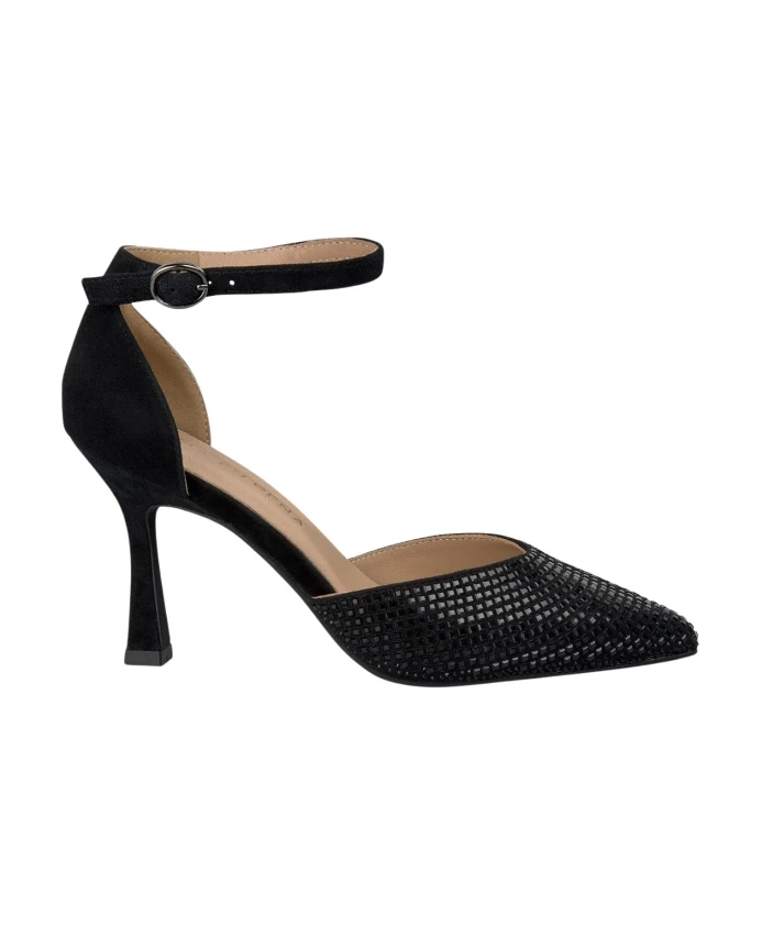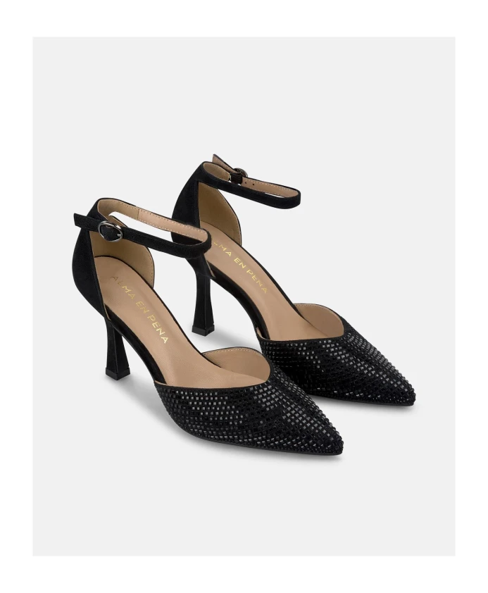 Туфли на высоком каблуке с ремешками и квадратной отделкой из страз. Заостренный носок. Пряжка и высота каблука 9 см.