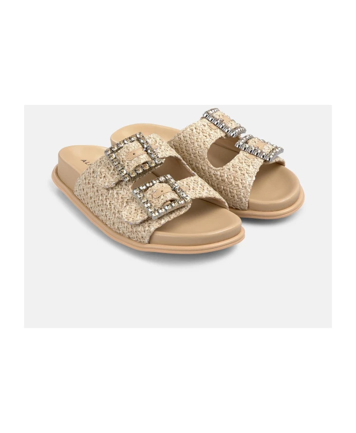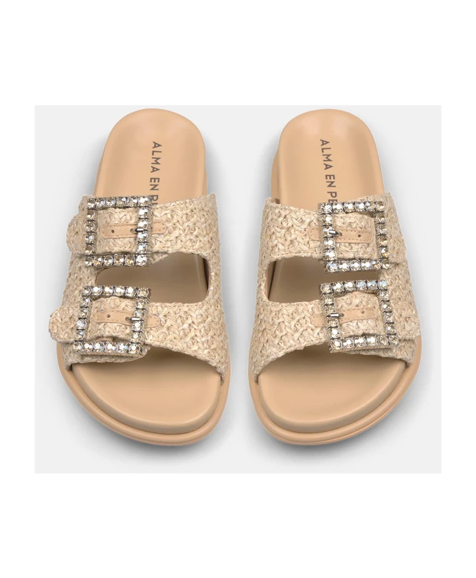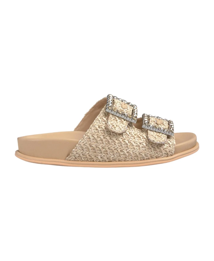 Плоские, удобные сандалии с пряжками, украшенными стразами, и закругленным носком. Модель без застежек, каблук 2 см.