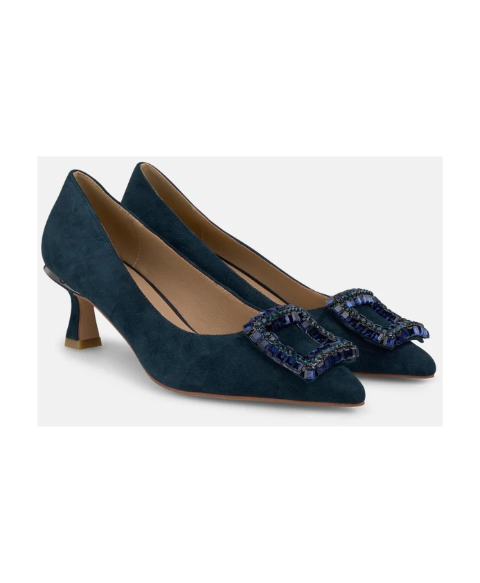 Женские туфли на каблуке с квадратной застежкой из стразов, заостренным носком и без застежки. Высота каблука 6 см.
