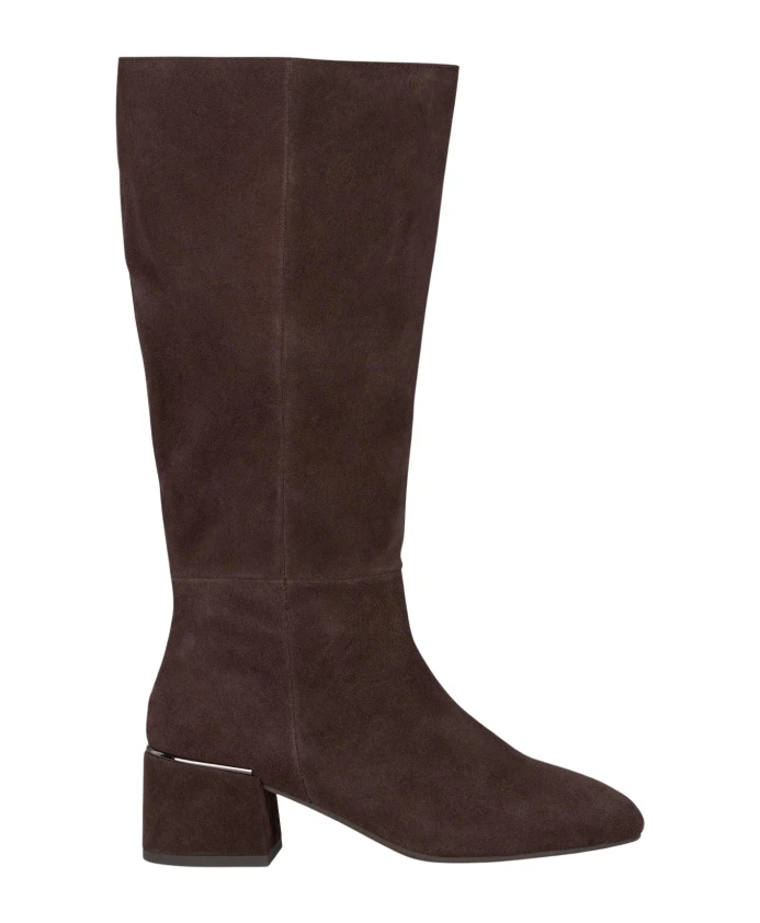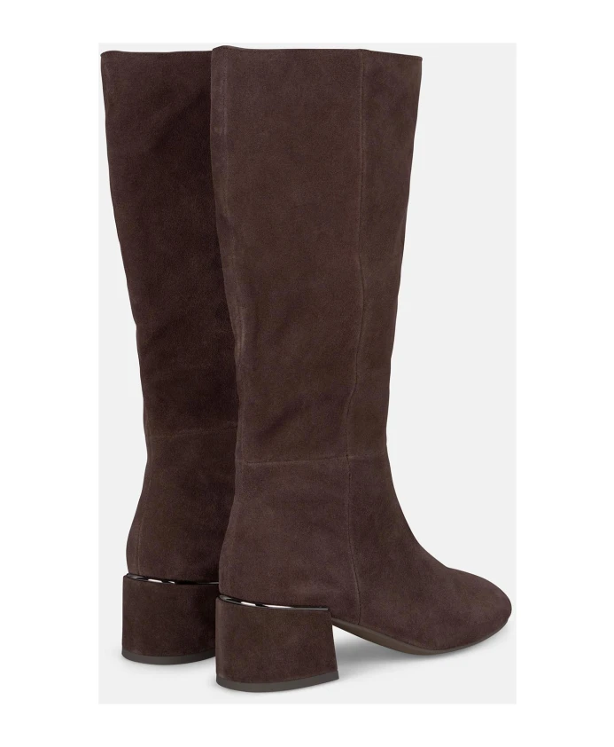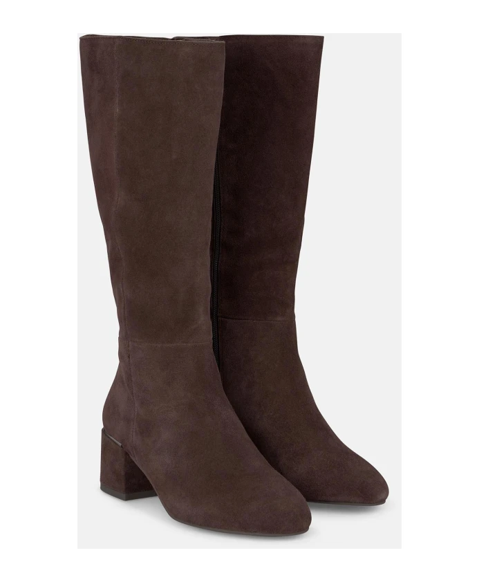 Женские сапоги на каблуке с закругленным носком и застежкой-молнией. Высота каблука 5,5 см, длина голенища 20 см.