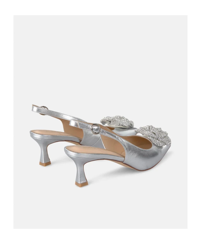 Туфли на плоской подошве, украшенные стразами. С закругленным носком. Застежка на пряжке, высота каблука 7,5 см.