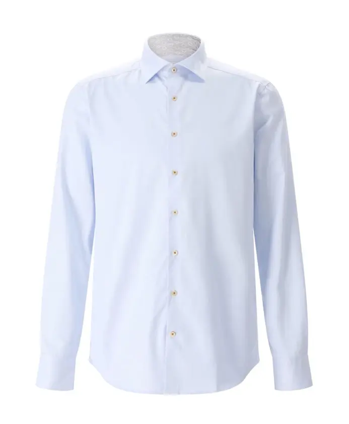 Рубашка приталенного кроя из высококачественного двухслойного хлопка, сочетающая современный стиль с исключительным комфортом. Облегающий силуэт создает эффектный образ, а узорчатые детали по низу и внутренней стороне воротника добавляют изысканности и стиля.