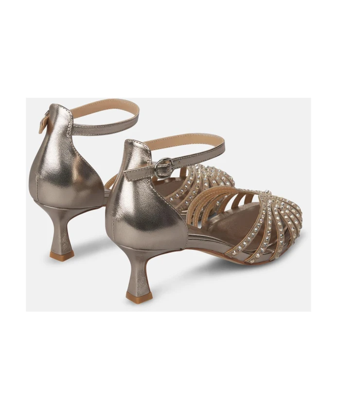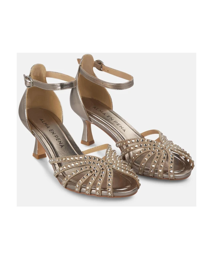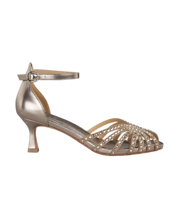 Сандалии в стиле кангрехера с открытым носком и отделкой стразами. Оснащены пряжкой и каблуком высотой 6 см.