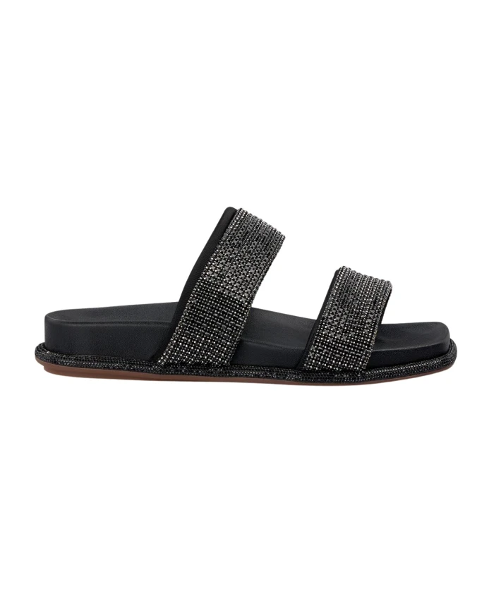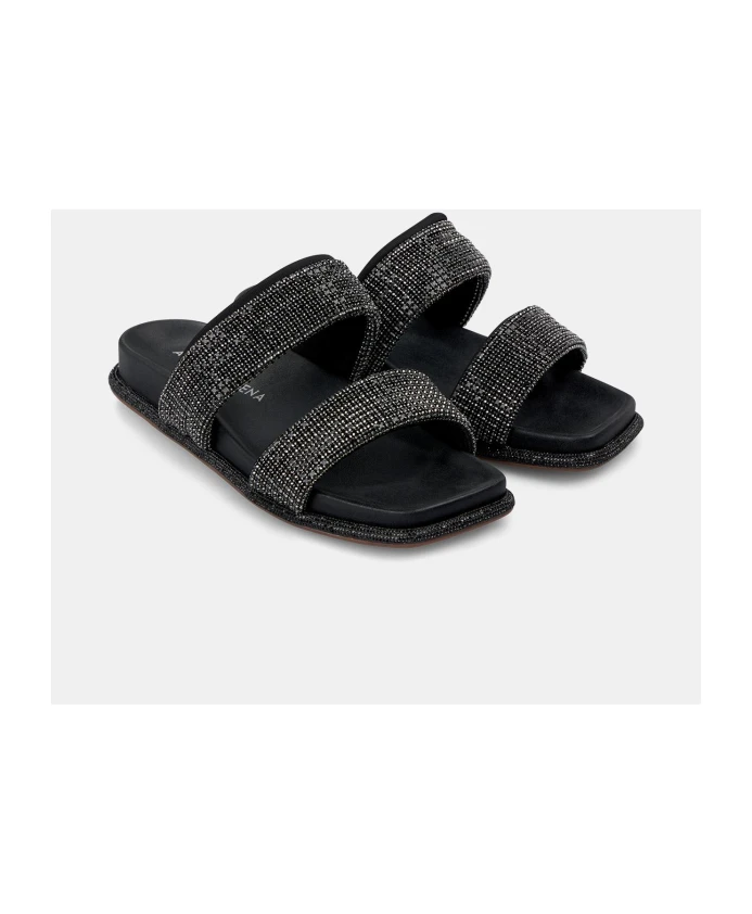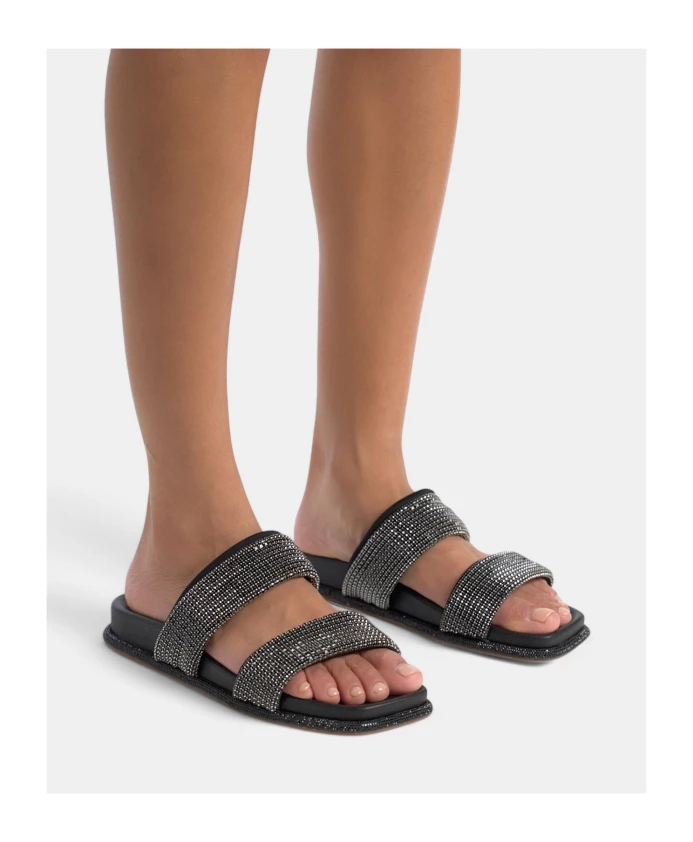 Сандалии на плоской подошве с отделкой стразами и квадратным носком. Застежка-молния, высота каблука 1 см.