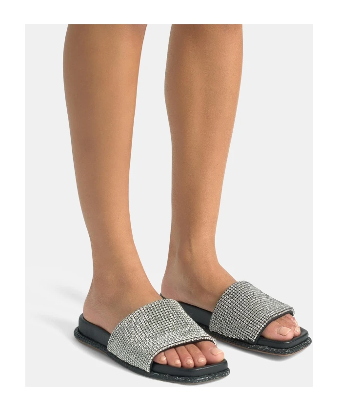 Сандалии на плоской подошве с отделкой стразами и квадратным носком. Застежка-молния, высота каблука 1 см.