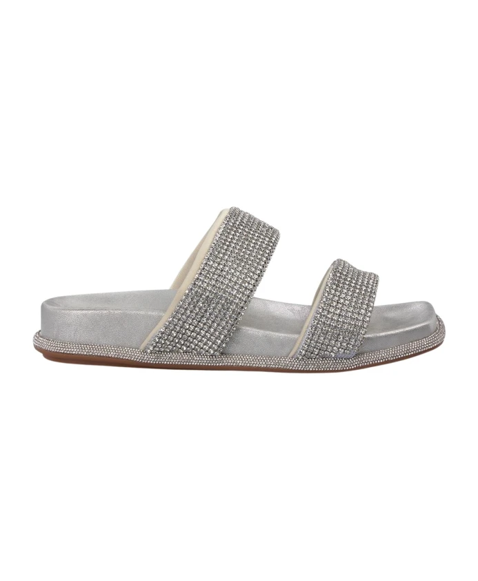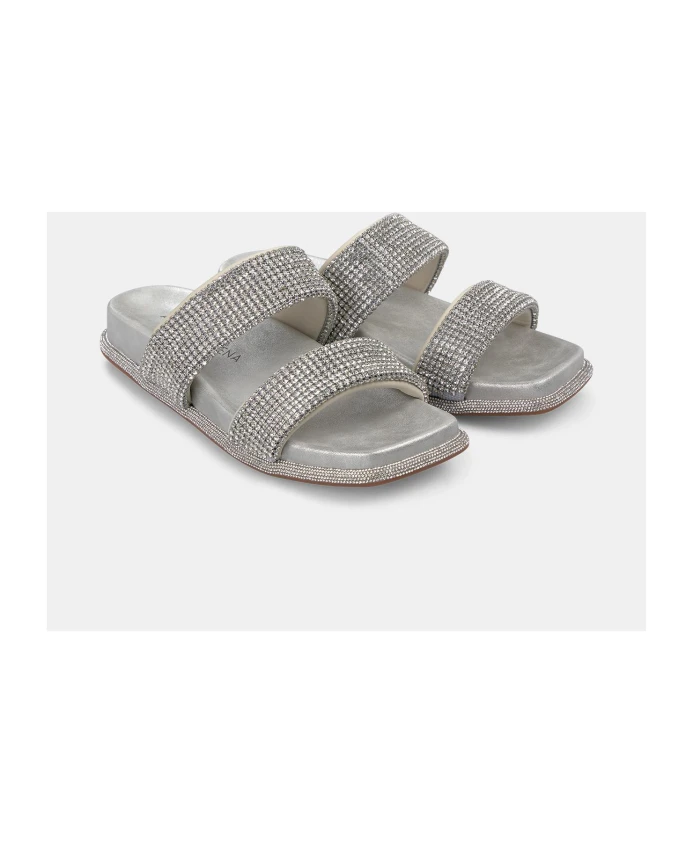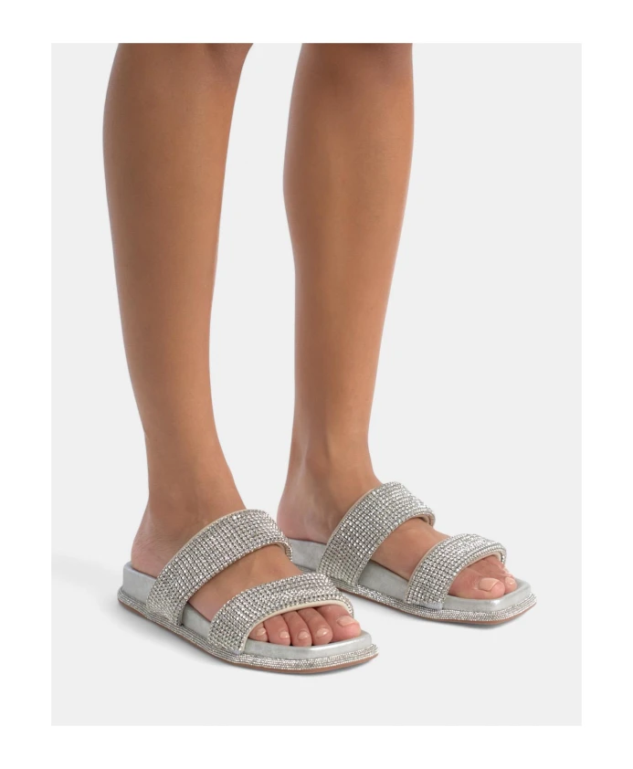 Сандалии на плоской подошве с отделкой стразами и квадратным носком. Застежка-молния, высота каблука 1 см.