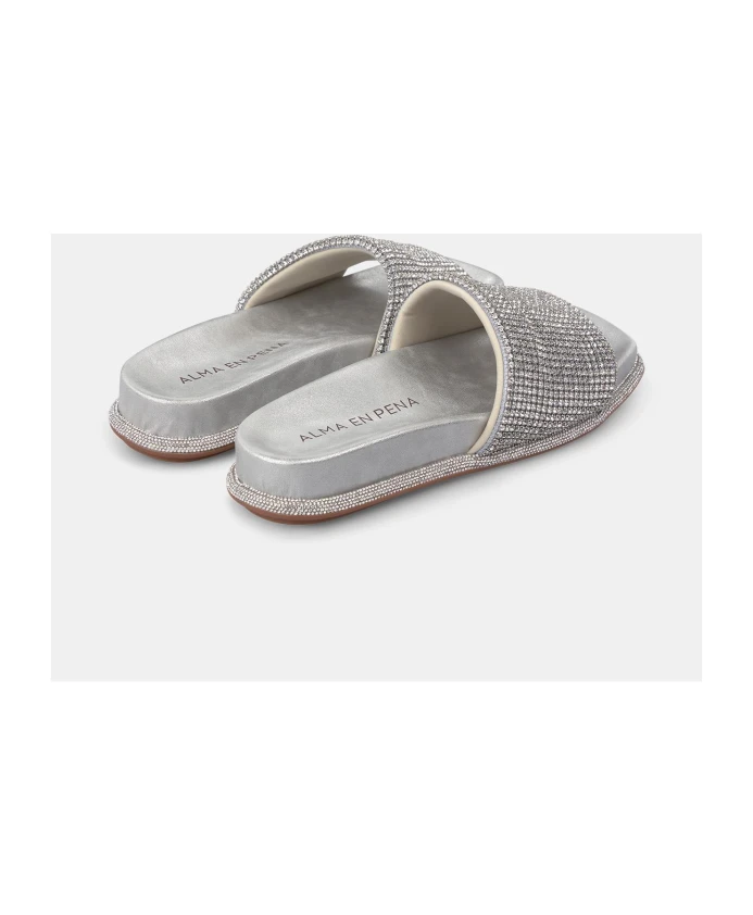 Сандалии на плоской подошве с отделкой стразами и квадратным носком. Застежка-молния, высота каблука 1 см.
