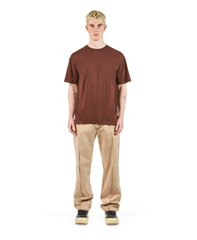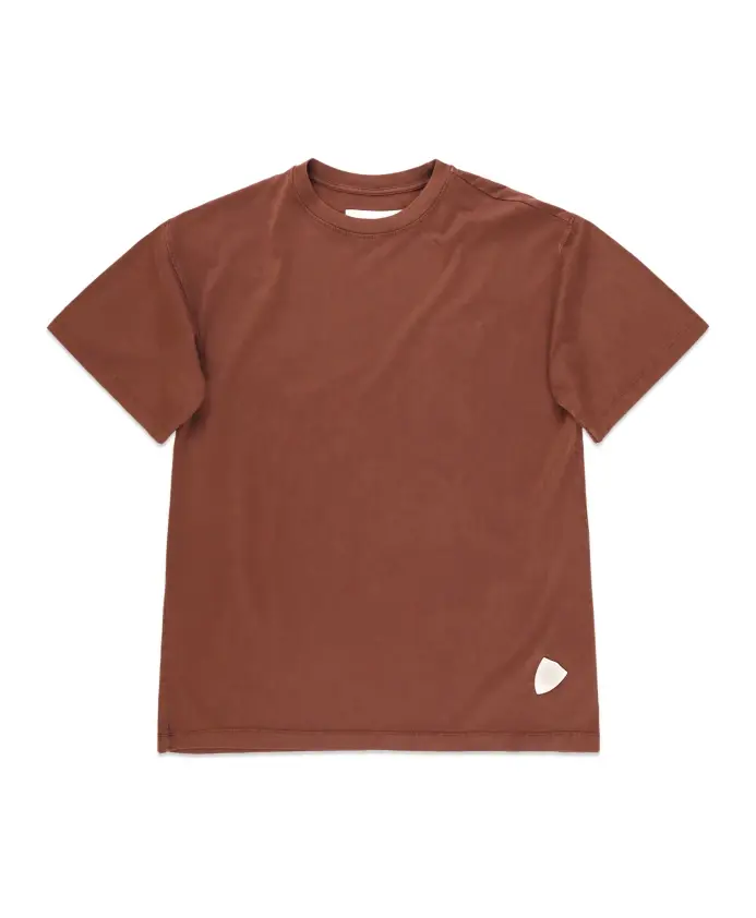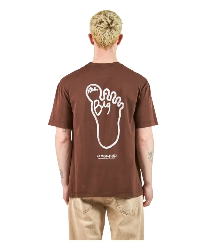 Футболка из чистого хлопкового трикотажа с крупным принтом на спине и прорезиненной нашивкой слева.