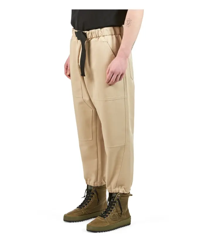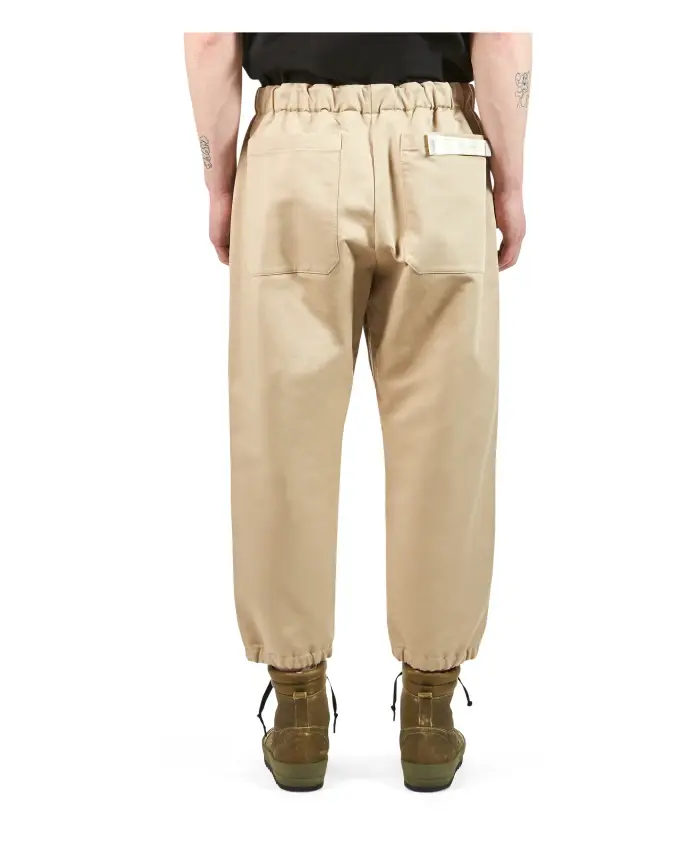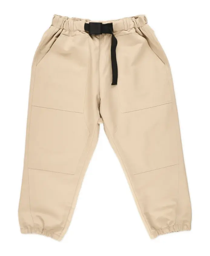 Рабочие брюки из плотного хлопчатобумажного габардина. С нашивками спереди и поясом с застежкой.