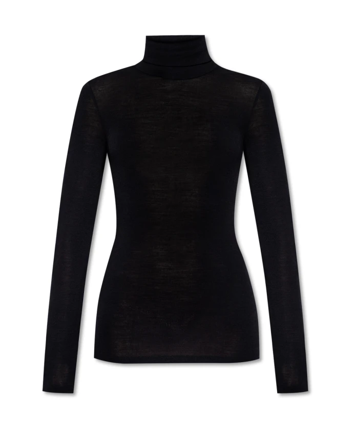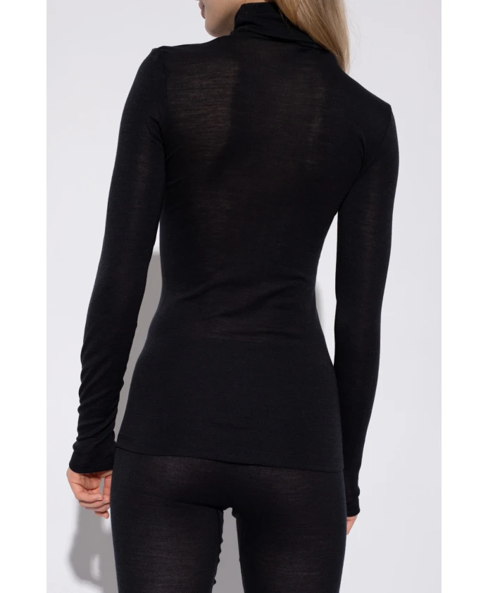 Черный топ от Hanro. Изготовлен из смеси шерсти и шелка, имеет воротник-стойку и длинные рукава.