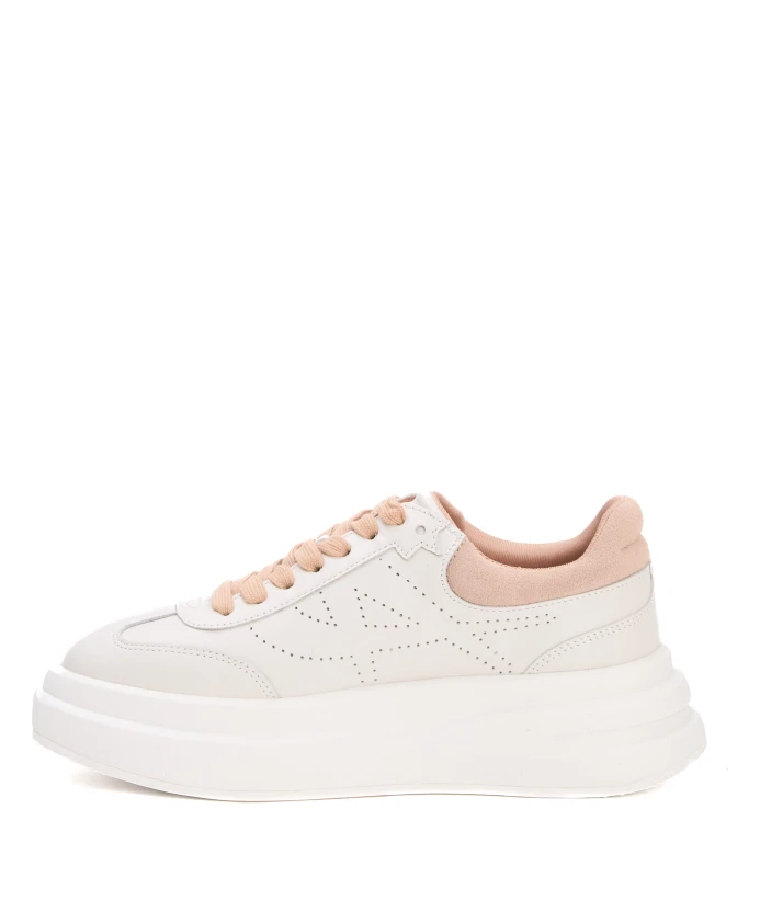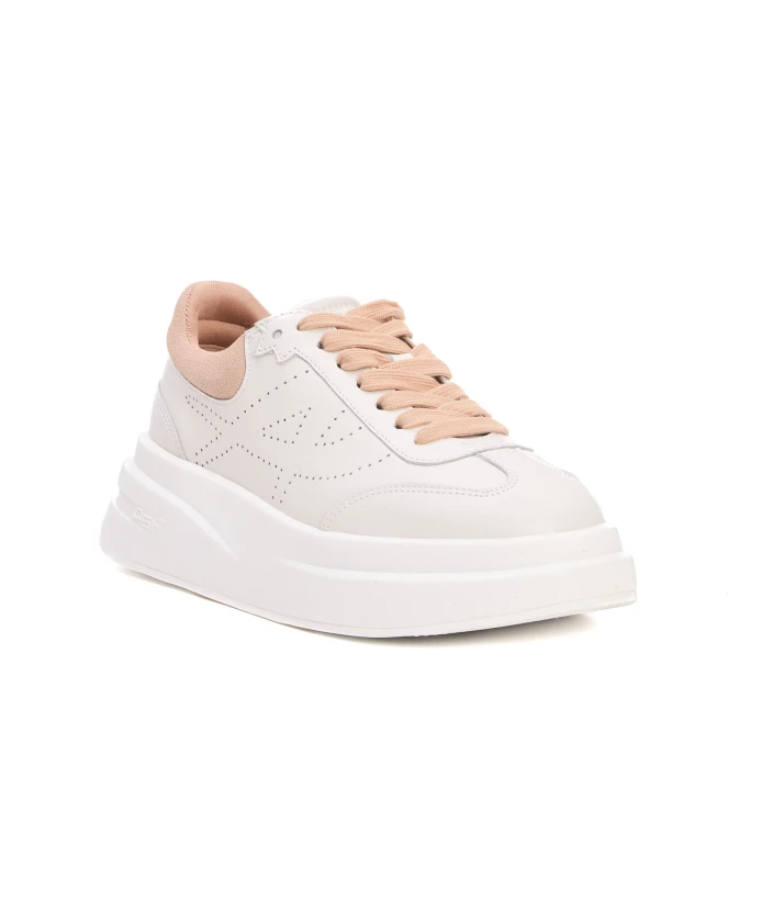 Женские белые кожаные кроссовки ASH с бежевой резиновой подошвой и двойным профилем.