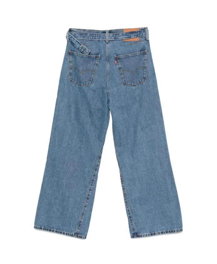Шлевки для ремня цвета индиго, застежка на пуговицы, пять карманов, прямой низ.