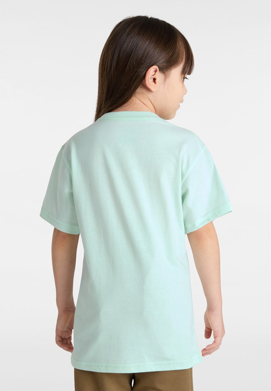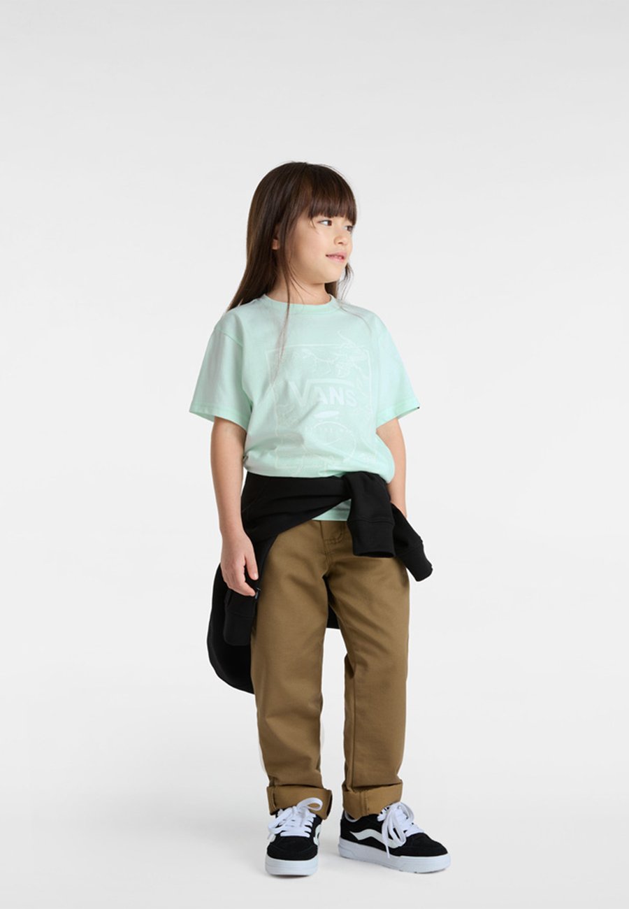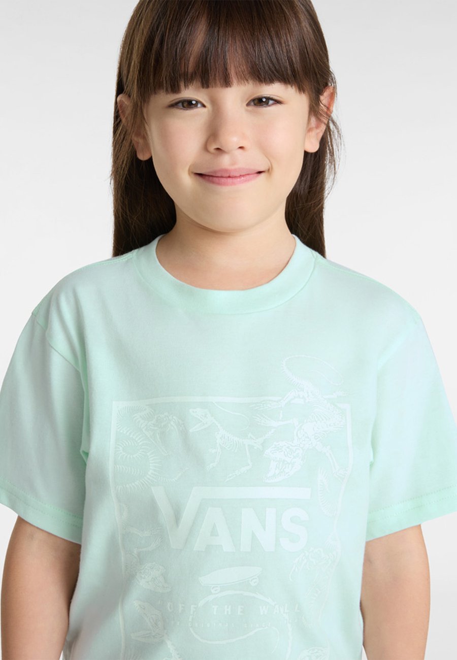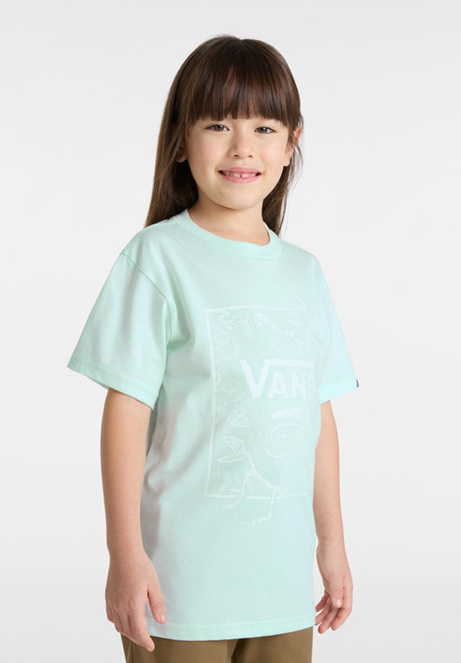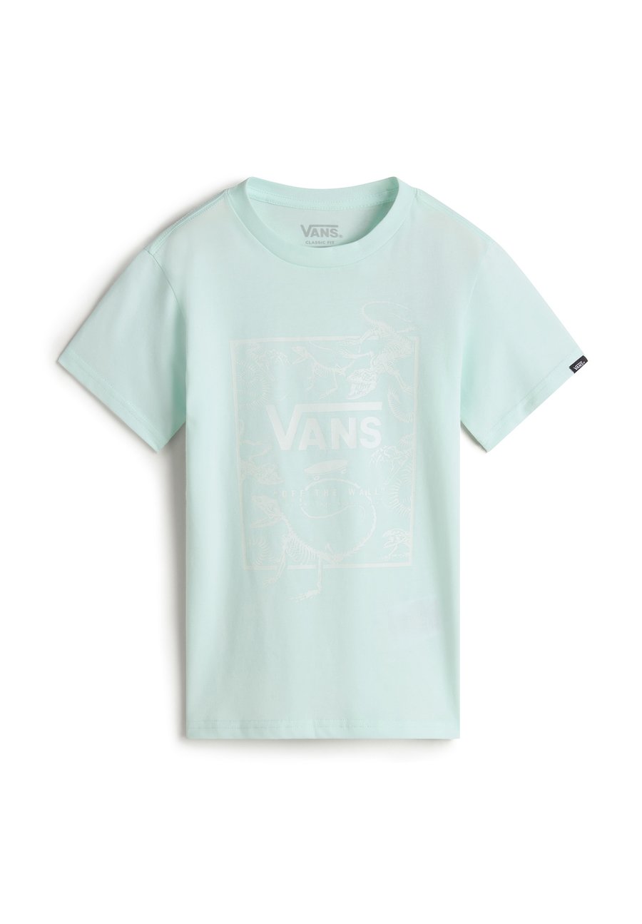 Футболка с динозаврами - Детская футболка с графическим принтом Состав цвета и материала: - Стильный мятно-зеленый цвет с изображением динозавров, светящихся в темноте - 100% высококачественный хлопок Особенности посадки и комфорта: - Классический крой для свободы движений - Короткие рукава с аккуратно обработанными манжетами - Ребристый круглый вырез для прочности - Стандартная длина до бедра - Легкий хлопок плотностью 145 г/м² для воздухопроницаемости Эта футболка, ориентированная на юных покупателей, привносит доисторическую крутость в повседневный стиль благодаря светящимся в темноте изображениям динозавров и фирменному брендингу Vans. Изготовленная из мягкого, дышащего хлопка универсального мятного цвета, эта футболка создана для комфорта и долговечности - идеально подходит для активных дней и повседневных приключений. Дизайн: ДинозаврыМатериал и уход