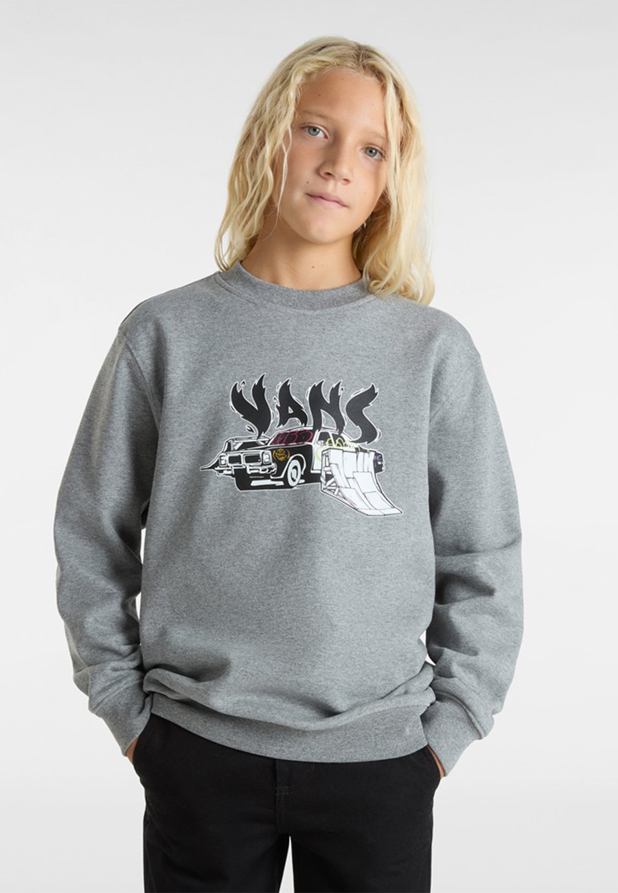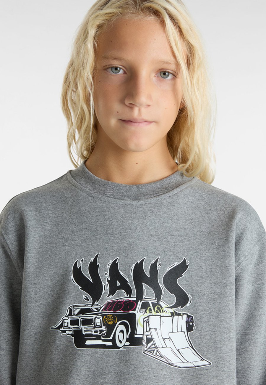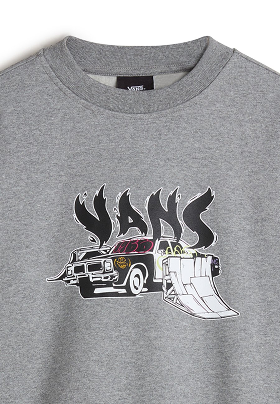 Свитшот Copout свободного кроя - повседневный свитшот для мальчиков. Цвет и состав материала: - Спортивный серый меланж с ярким черно-белым графическим принтом - 65% хлопок, 35% полиэстер, флис с начесом. Особенности посадки и комфорта: - Свободный силуэт для свободы движений - Ребристый круглый вырез горловины с аккуратной отделкой - Классические длинные рукава с ребристыми манжетами - Мягкая начесная внутренняя сторона для дополнительного комфорта - Прочная ткань плотностью 280 г/м². Этот свитшот в уличном стиле сочетает в себе классический стиль Vans с ярким винтажным графическим принтом в виде автомобиля и рампы. Ткань из смеси хлопка и полиэстера обеспечивает идеальный баланс комфорта и долговечности, а свободный крой позволяет легко надевать несколько слоев одежды и обеспечивает свободу движений. Будь то катание на скейт-парке или встреча с друзьями, эта толстовка подарит вам непринужденный стиль и фирменный дух Vans. Дизайн: Транспортные средстваМатериал и уход