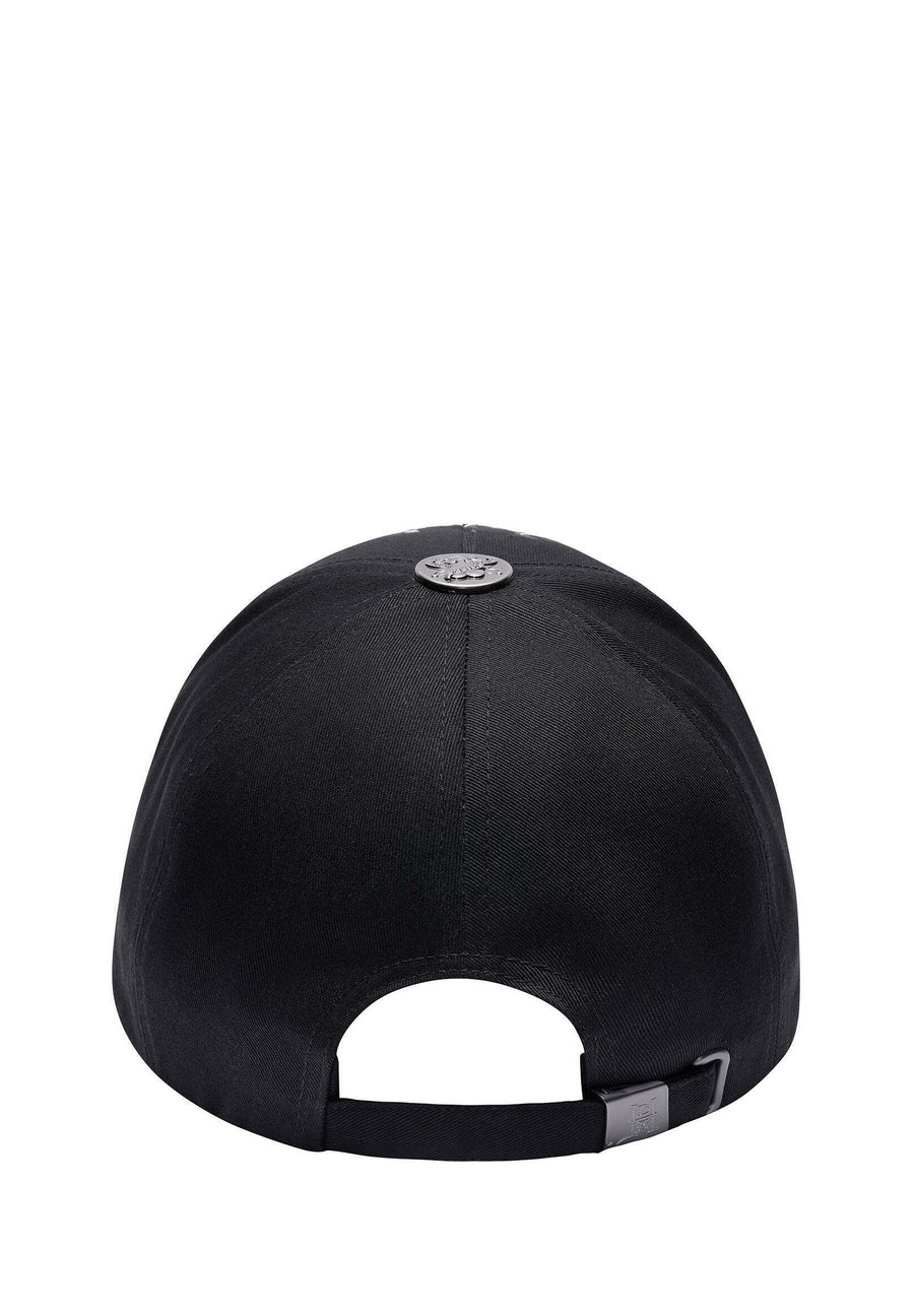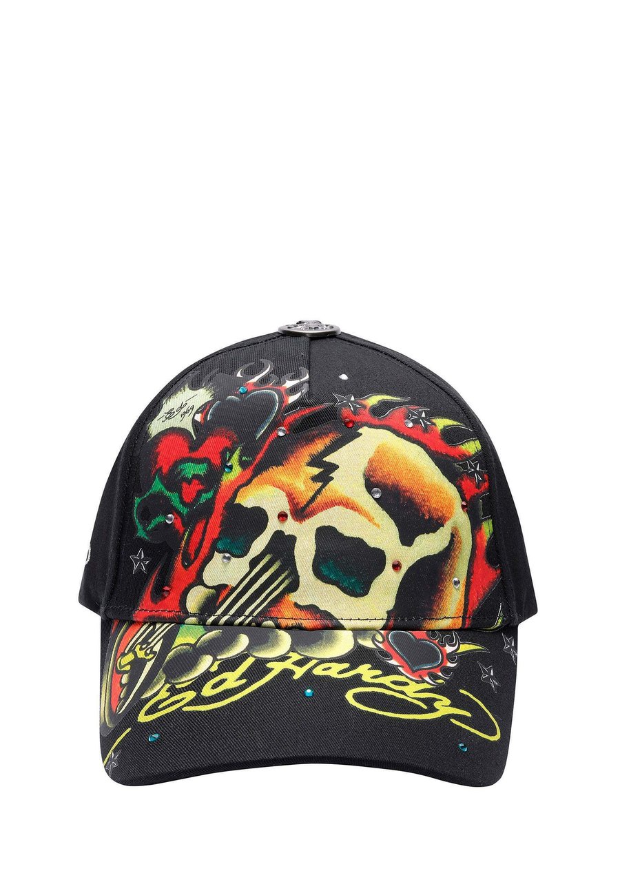 Унисекс кепка SKULL CHOPPER с 6 панелями и декором. Черная основа. Графический рисунок татуировки Пылающий череп Chopper. Застежка-пряжка с тиснением цвета оружейной стали и регулируемый ремешок. Классическая металлическая пуговица с тиснением сверху. Принт на передней части с классическим логотипом Ed Hardy. Многоцветная винтажная отделка стразами. 6-панельная кепка. Вышитый логотип EH сбоку. Детали: стразы.Материал и уход