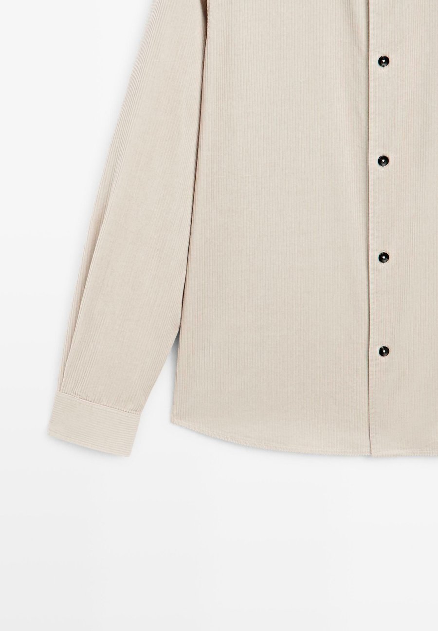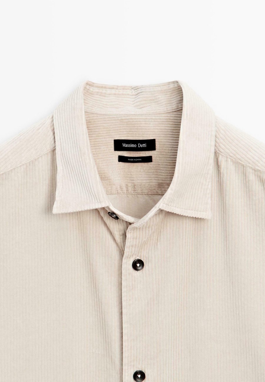 Воротник рубашки. Стандартный крой: этот крой обеспечивает комфорт благодаря немного большему свободному пространству в области туловища и рук, создавая классический, но в то же время расслабленный стиль. Изготовлено из 100% хлопка. Длинные рукава с манжетами на пуговицах. Вельветовая ткань. Застежка на пуговицы спереди. Воротник: Отложной воротник.Материал и уход