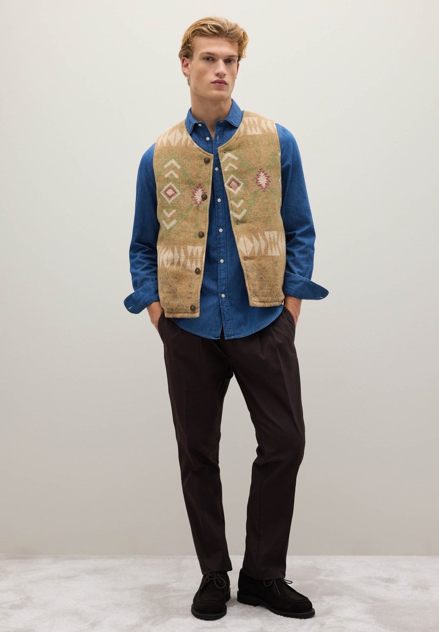 Разноцветный жилет из шерстяной смеси из коллекции PIOMBO выделяется своим красочным геометрическим узором, добавляя оригинальности вашему гардеробу. Застежка на пуговицы практична, а стандартный крой обеспечивает комфорт в любой ситуации. Вырез горловины: Низкий V-образный вырезМатериал и уход