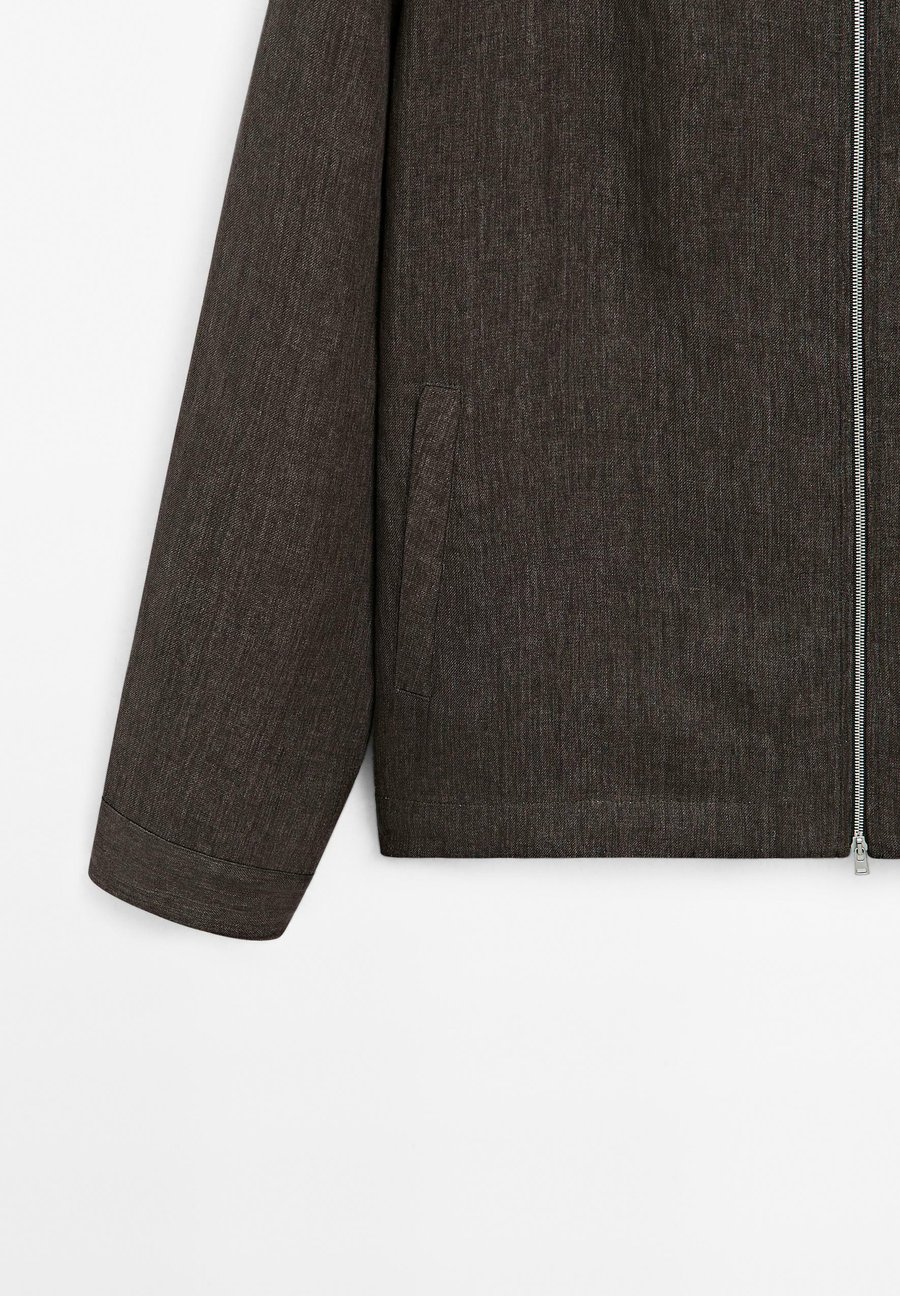 Два боковых кармана. Длинные рукава с манжетами на пуговицах. Застежка на двустороннюю молнию. Эффект потертости. Эластичная резинка по низу. Куртка-бомбер из 100% льна. Воротник: Воротник-стойкаМатериал и уход