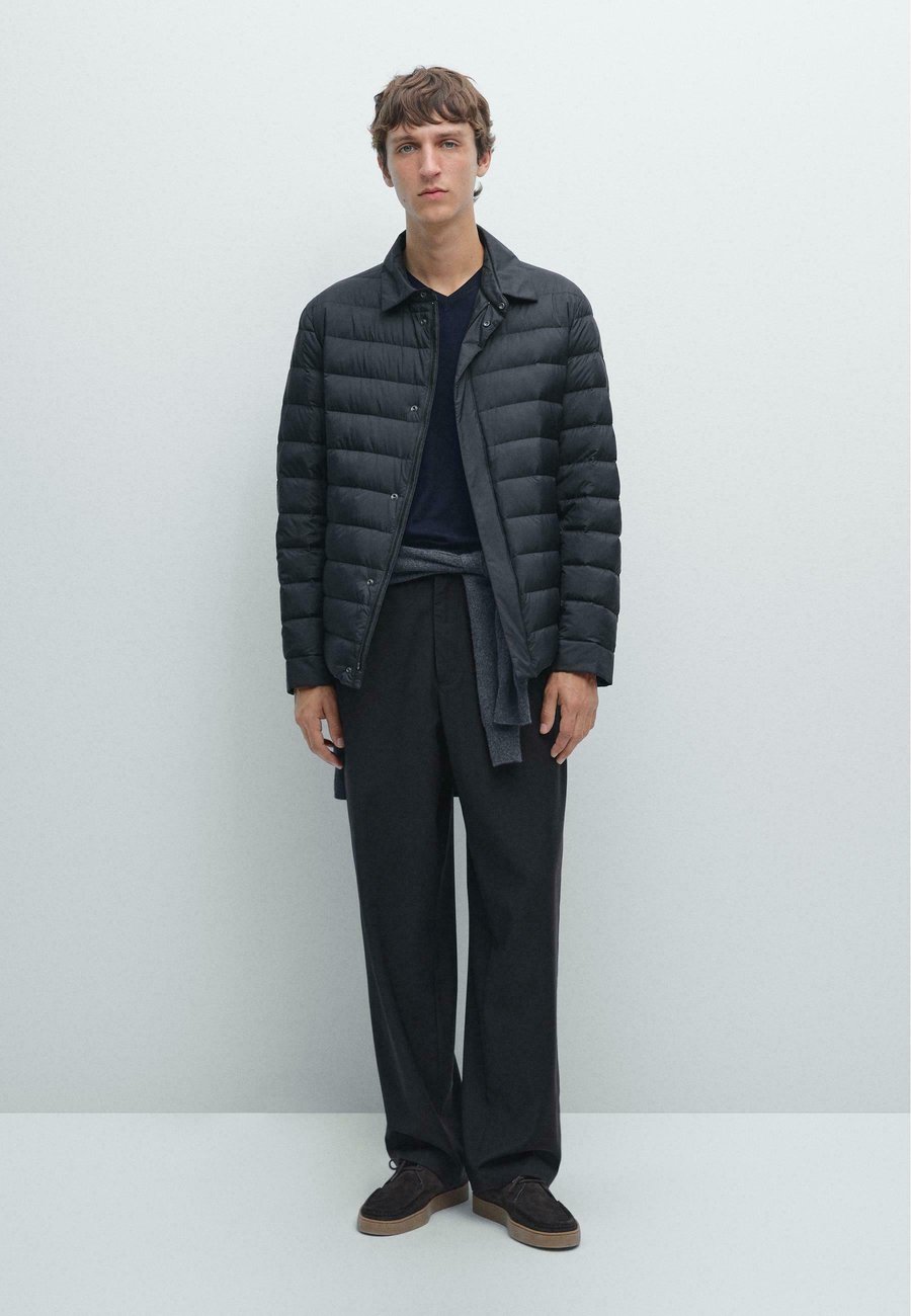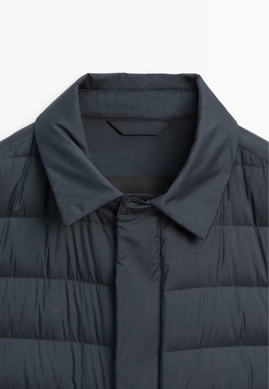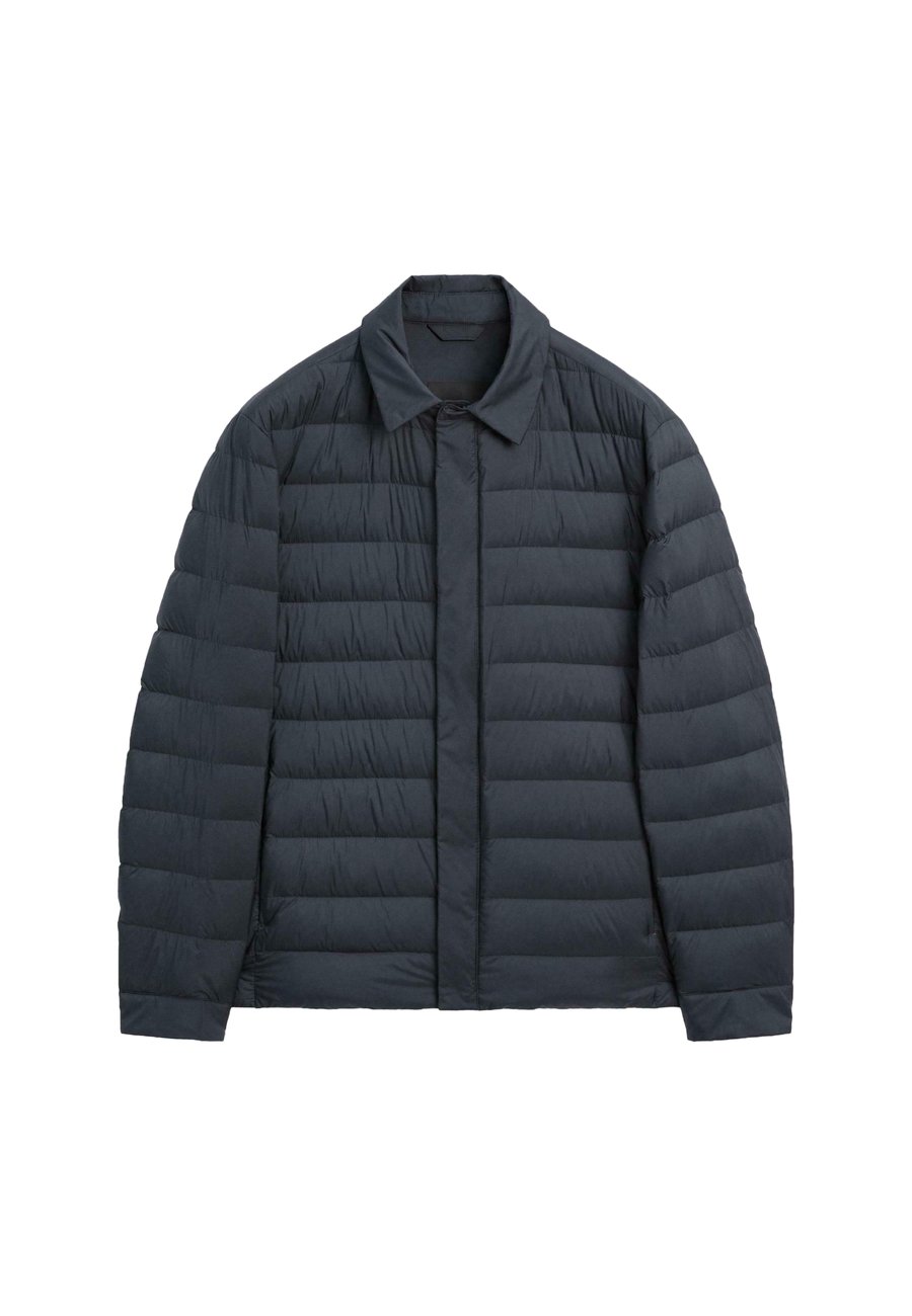 Водоотталкивающая ткань. Двусторонняя застежка-молния, скрытая планкой с кнопками. Два боковых кармана на молнии. Рубашечный воротник. Стеганая куртка с пуховой подкладкой. Длинные рукава с манжетами на кнопках. Внутренний карман на молнии. Воротник: Отложной воротник.Материал и уход