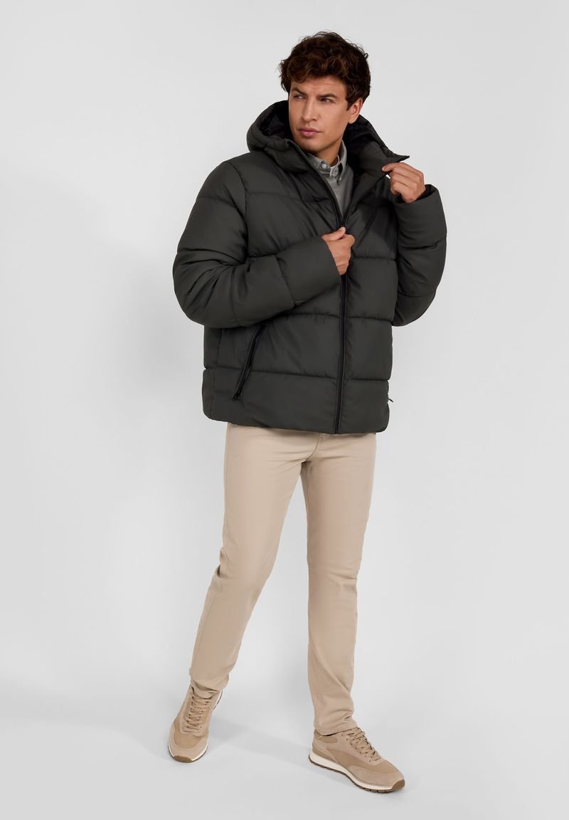 Мужская куртка с капюшоном из искусственной кожи с полиэстеровым покрытием для водоотталкивающих свойств и долговечности. Имеет горизонтальную стежку и теплый полиэстеровый утеплитель для превосходной теплоизоляции в холодную погоду. Застежка-молния спереди и два боковых кармана на молнии обеспечивают надежное хранение и легкий доступ. Капюшон и полиэстеровая подкладка по всей куртке гарантируют комфорт и сохранение тепла. Классический крой с длинными рукавами обеспечивает универсальность стиля как для активного отдыха, так и для повседневной носки. Погода: ДождьМатериал и уход