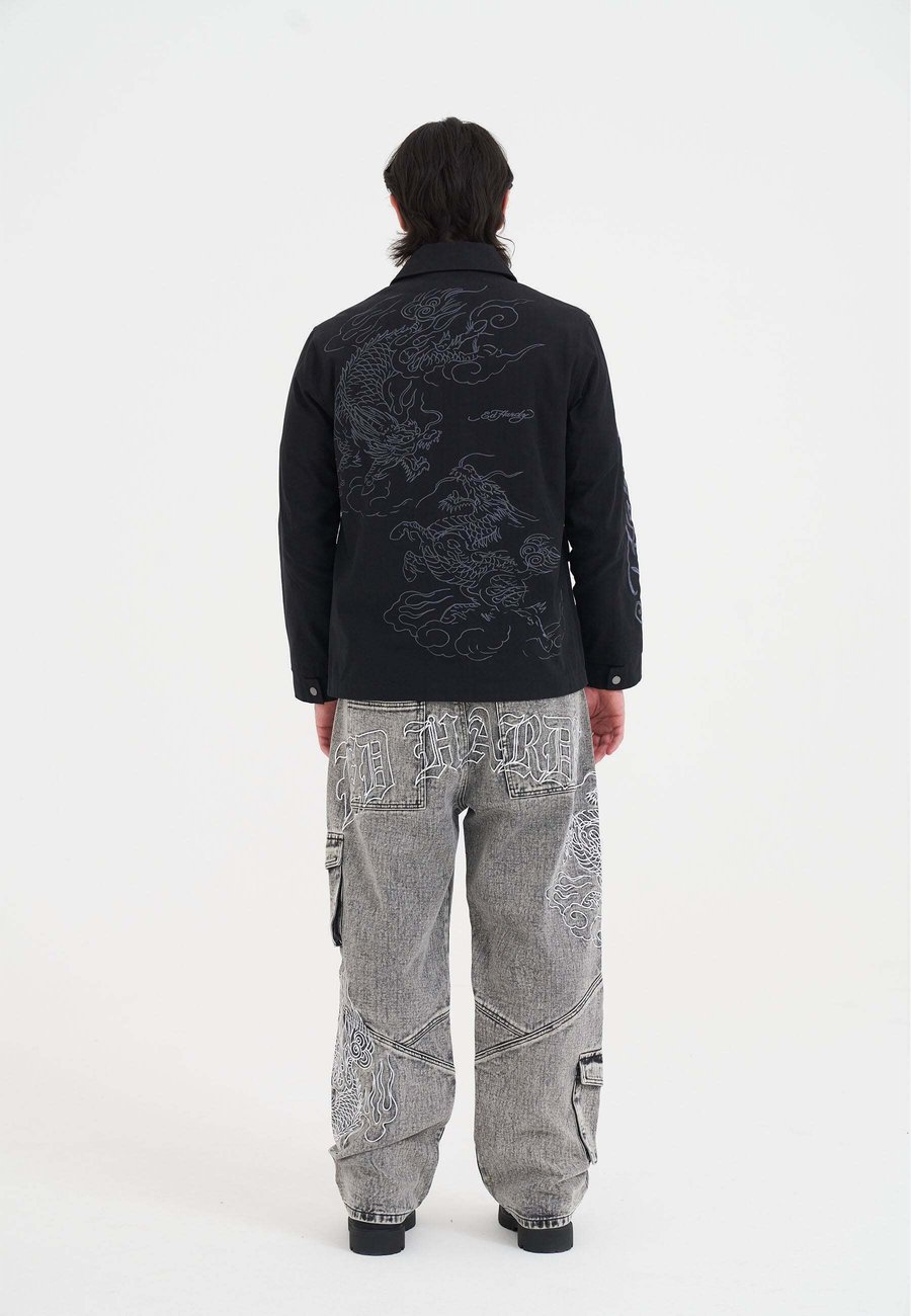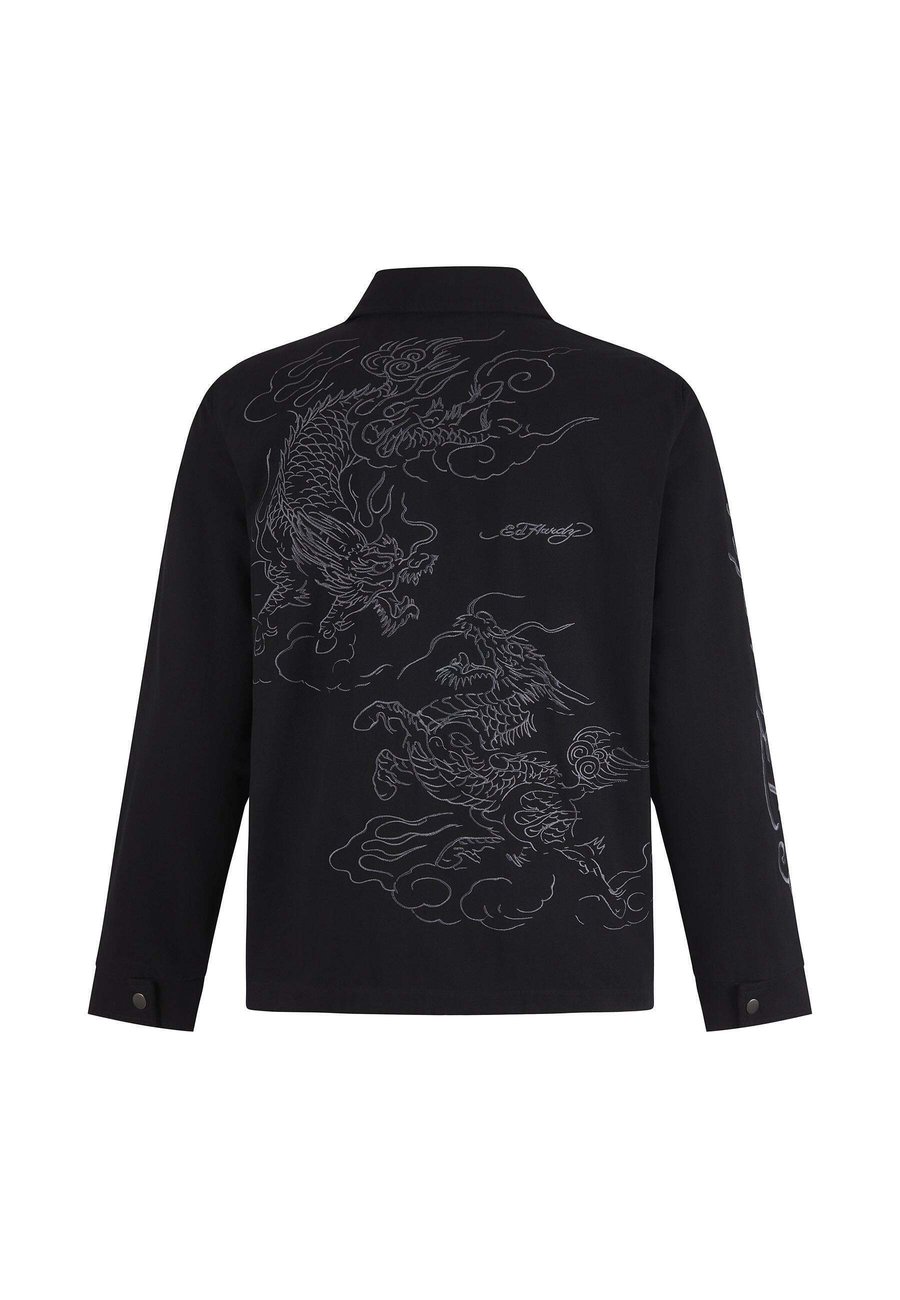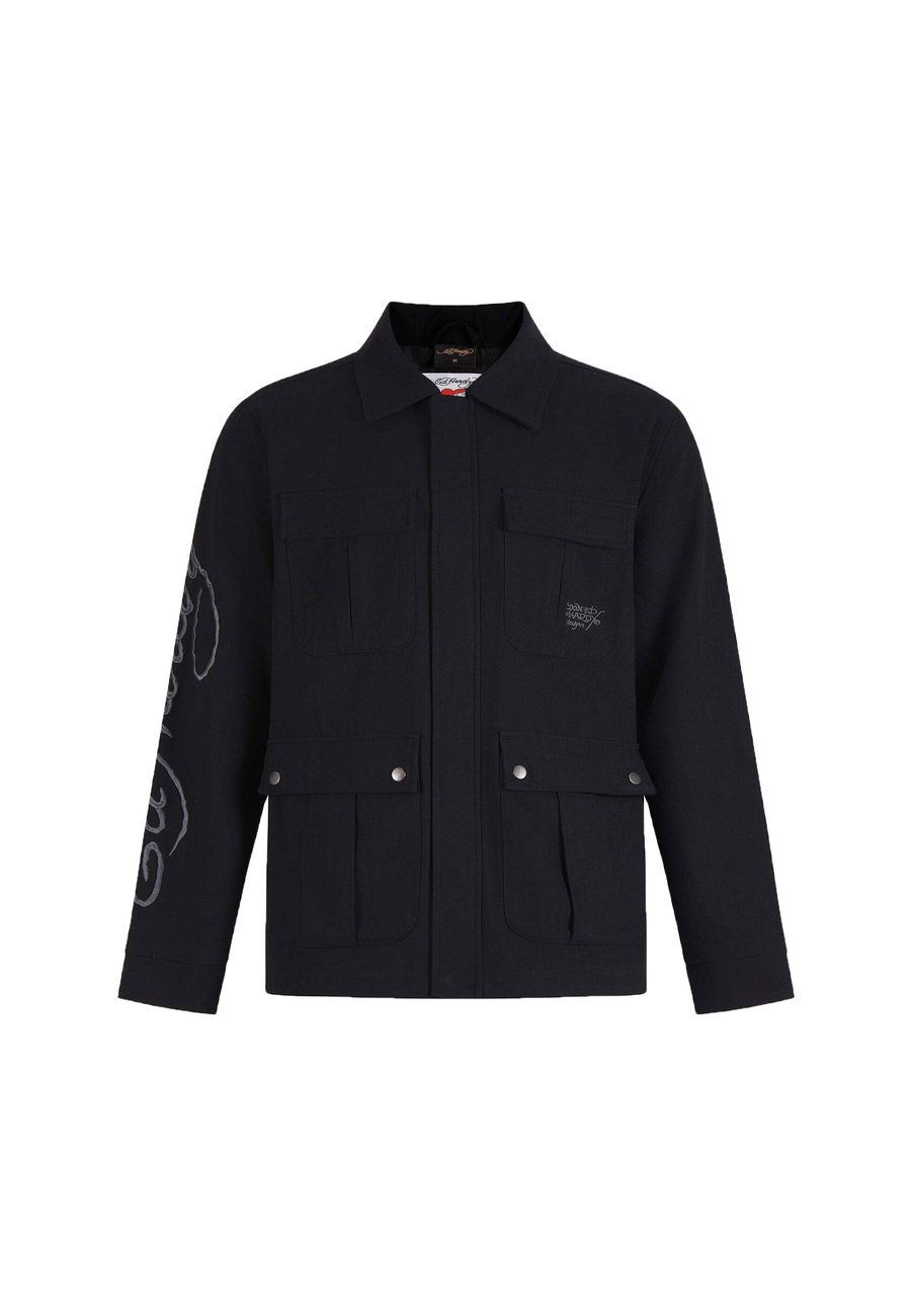 Мужская рабочая куртка OUTLINE DRAGON черного цвета. Контрастная вышивка. Карманы в стиле милитари. Застежка на молнию и кнопки по центру спереди. 100% хлопок, елочка. Подкладка из 100% полиэстера. Наш модель (рост: 183 см, талия: 71 см) носит размер Medium. Воротник: отложной. Застежка: молния. Карманы: нагрудный карман, накладные карманы. Детали: вышивка, закрытая застежка.Материал и уход