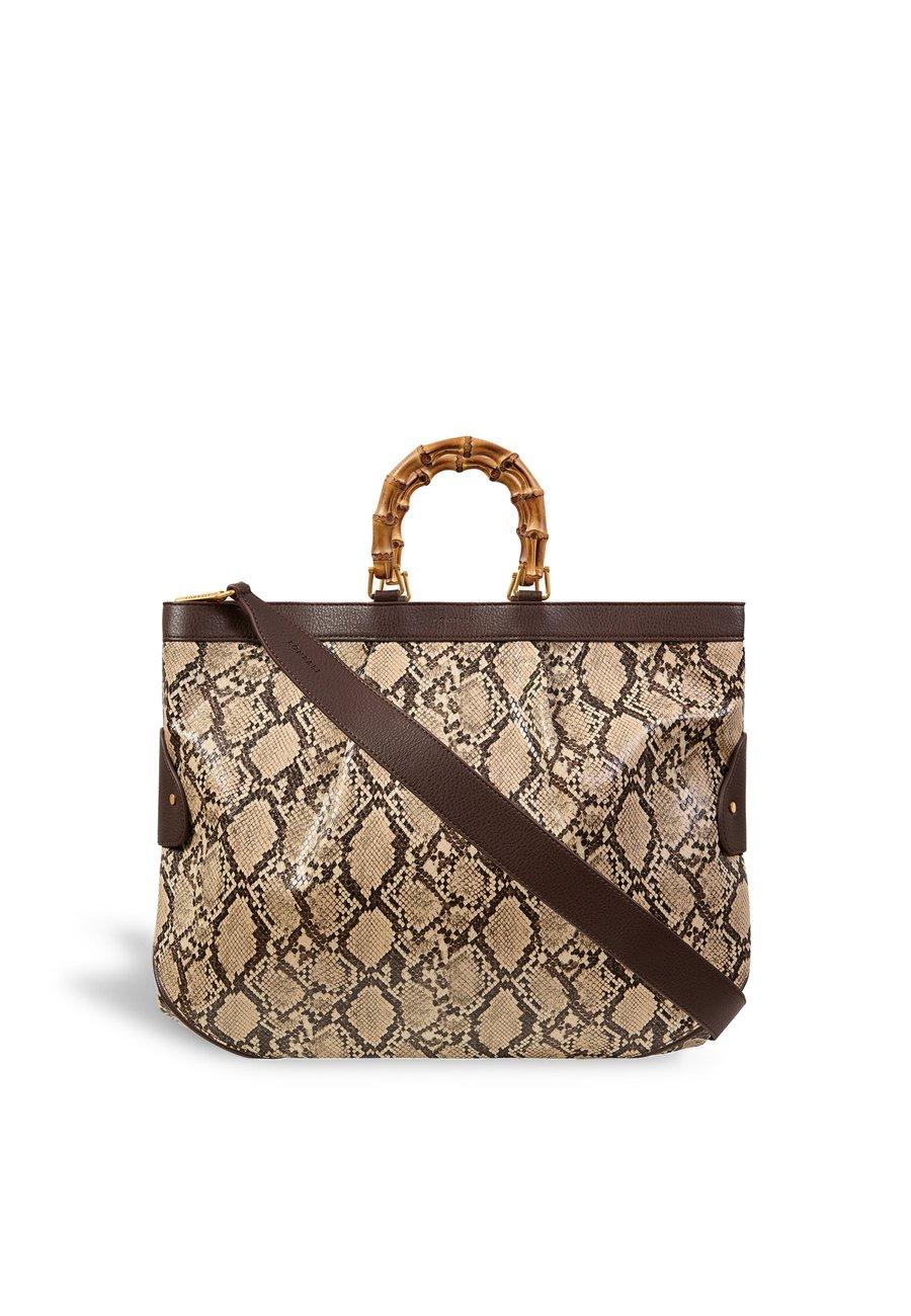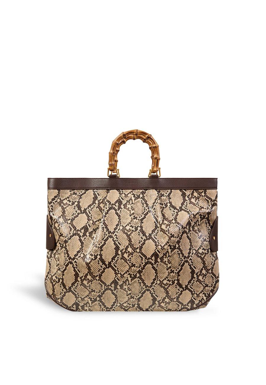 Большая сумка-тоут "Змея" - это женская сумка с изысканным дизайном. Она имеет принтованную отделку с коричневыми деталями. Ручки изготовлены из бамбука, что придает им естественный и уникальный стиль, контрастирующий с принтом сумки. Форма сумки структурированная, но при этом слегка гибкая, идеально подходит для повседневного использования или для дополнения более формальных образов. Включает в себя такие детали, как металлические заклепки по бокам, добавляющие функциональности дизайну. Отделения: Просторное внутреннее отделение, карман для мобильного телефонаМатериал и уход