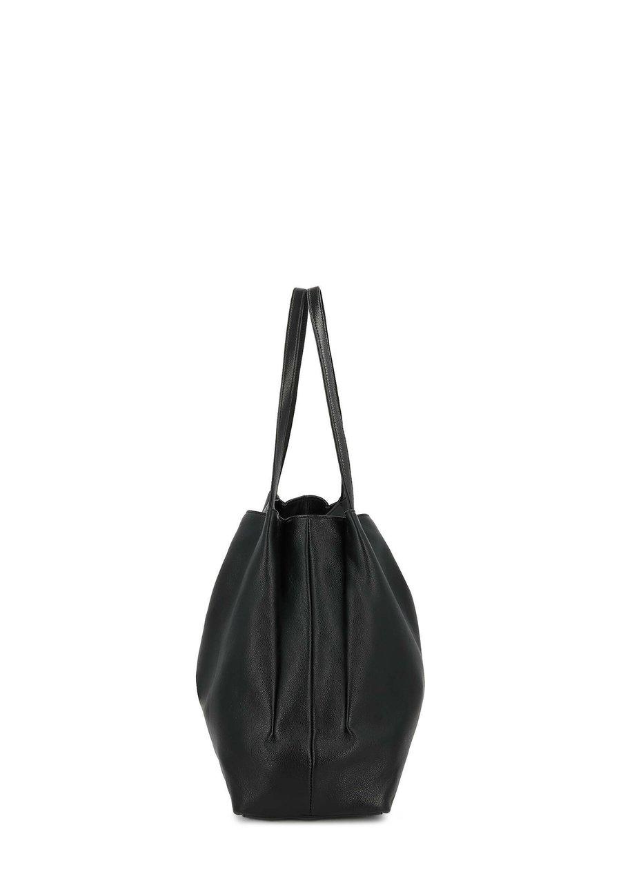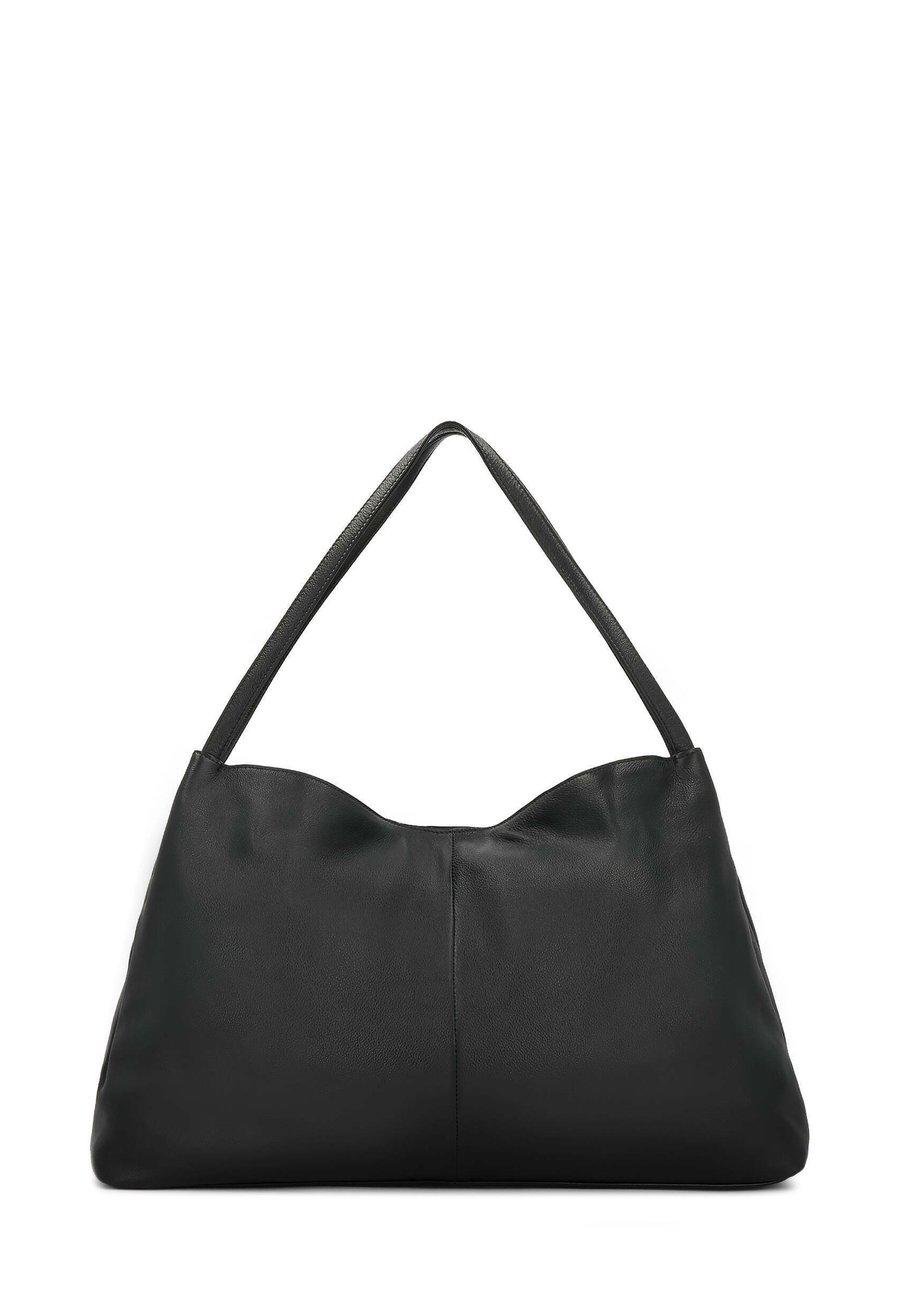 Функциональная сумка геометрической трапециевидной формы, изготовленная из гладкой натуральной кожи классического черного цвета. Простая форма нарушена декоративным ремешком с металлической застежкой, которая служит для закрытия основного отделения. Модель имеет широкий, удобный плечевой ремень и ненавязчивый серебристый логотип KAZAR STUDIO, расположенный в нижней части сумки. Идеально подходит для повседневного стиля для женщин, которые ищут сочетание современного дизайна и вневременной элегантности. Детали продукта: Основное отделение сумки закрывается на магнитную застежку. Имеет 1 открытый карман и 1 карман на молнии. Отделения: Карман для мобильного телефона, просторное внутреннее отделение.Материал и уход