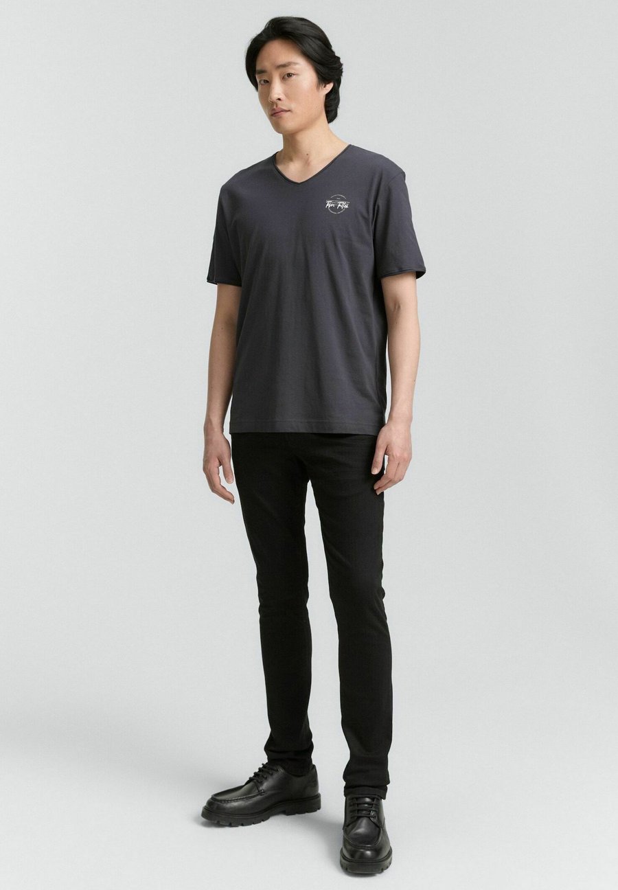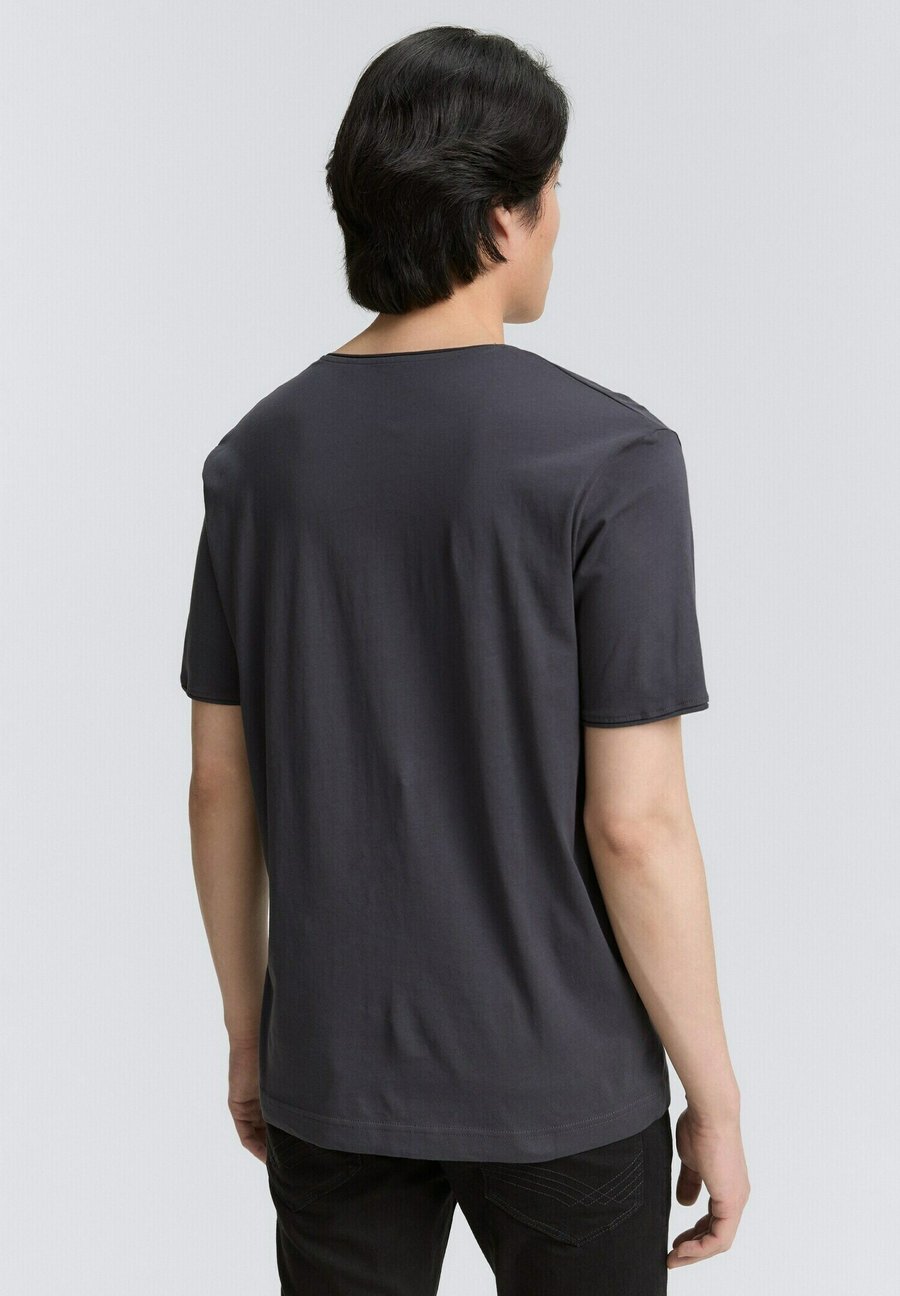 Базовая футболка с небольшим логотипом на груди и подвернутыми краями воротника и манжет рукавов. Изготовлена из однослойного трикотажа из хлопка. Вырез горловины: Низкий V-образный вырезМатериал и уход