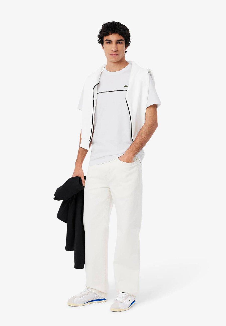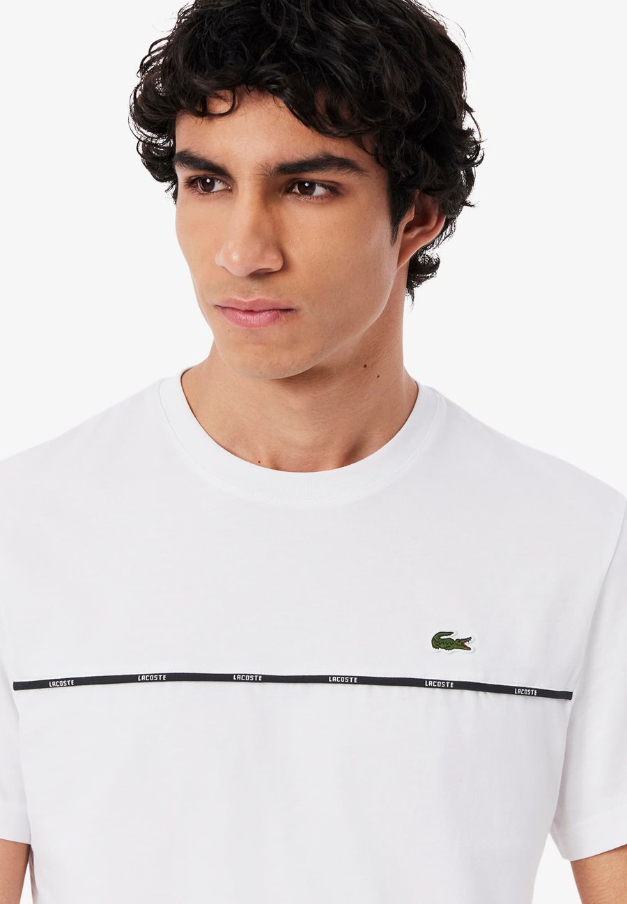 Эта футболка Lacoste из хлопкового трикотажа украшена контрастной фирменной отделкой по центру и вышитым крокодилом на груди, что придает ей повседневный шик. Вырез горловины: круглыйМатериал и уход