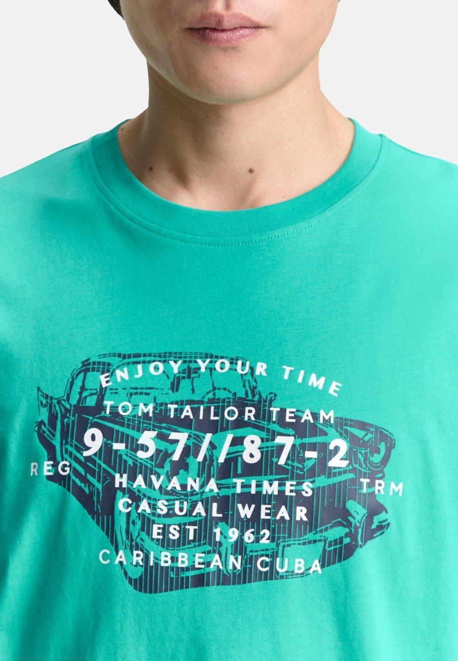 Футболка с летним принтом на груди. Изготовлена из однослойного трикотажа из хлопка. Вырез горловины: круглый.Материал и уход