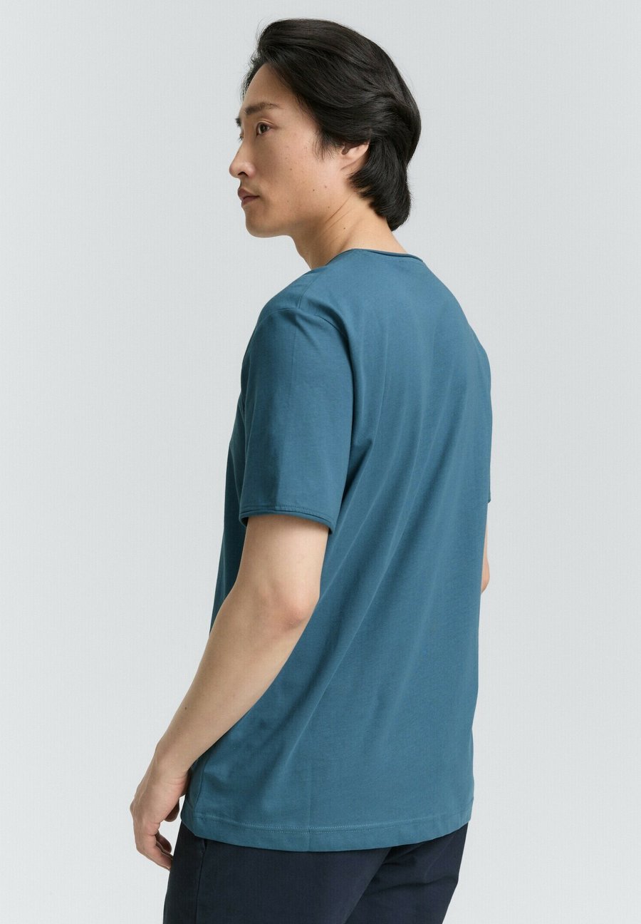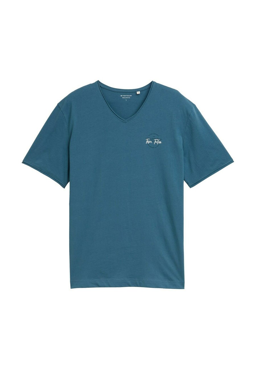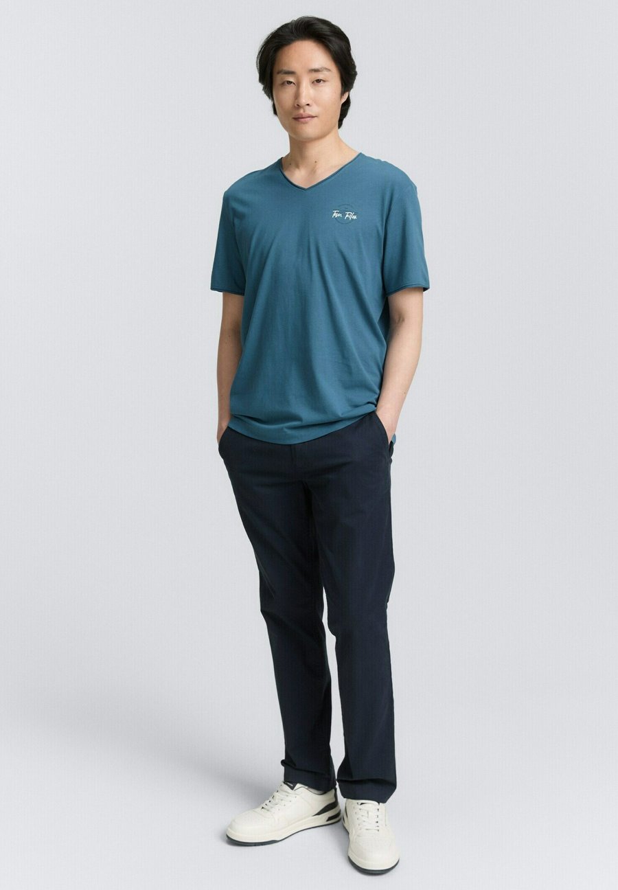 Базовая футболка с небольшим логотипом на груди и подвернутыми краями воротника и манжет рукавов. Изготовлена из однослойного трикотажа из хлопка. Вырез горловины: Низкий V-образный вырезМатериал и уход