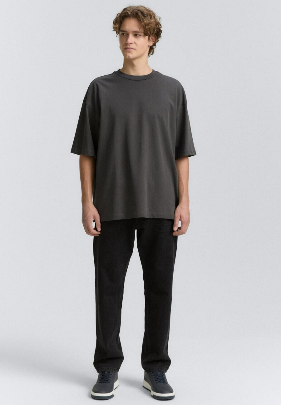 Базовая футболка оверсайз однотонного цвета. Изготовлена из плотной непрозрачной хлопковой трикотажной ткани. Вырез горловины: круглый.Материал и уход