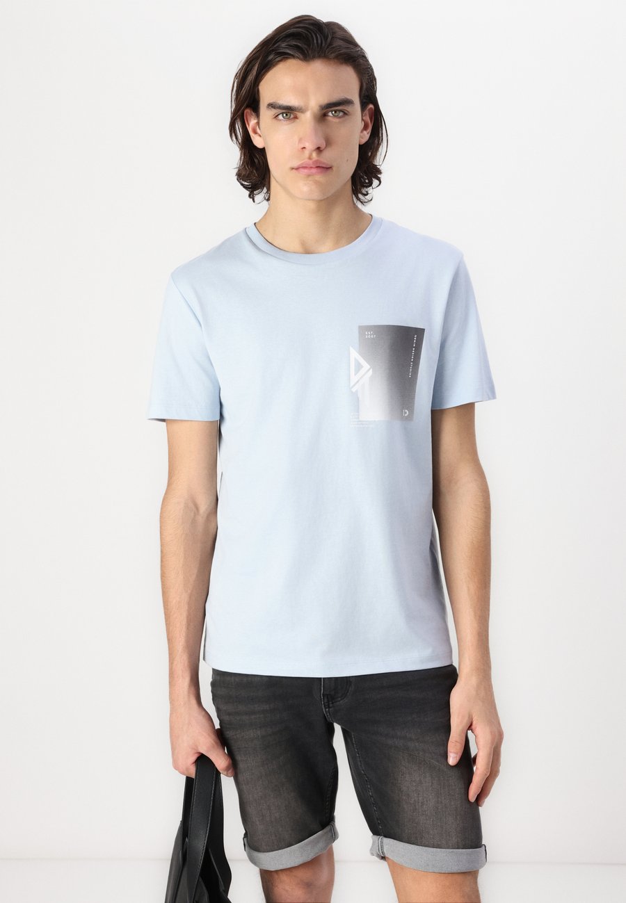 Футболка с принтом на груди. Изготовлена из однослойного трикотажа из хлопка. Вырез горловины: круглый.Материал и уход