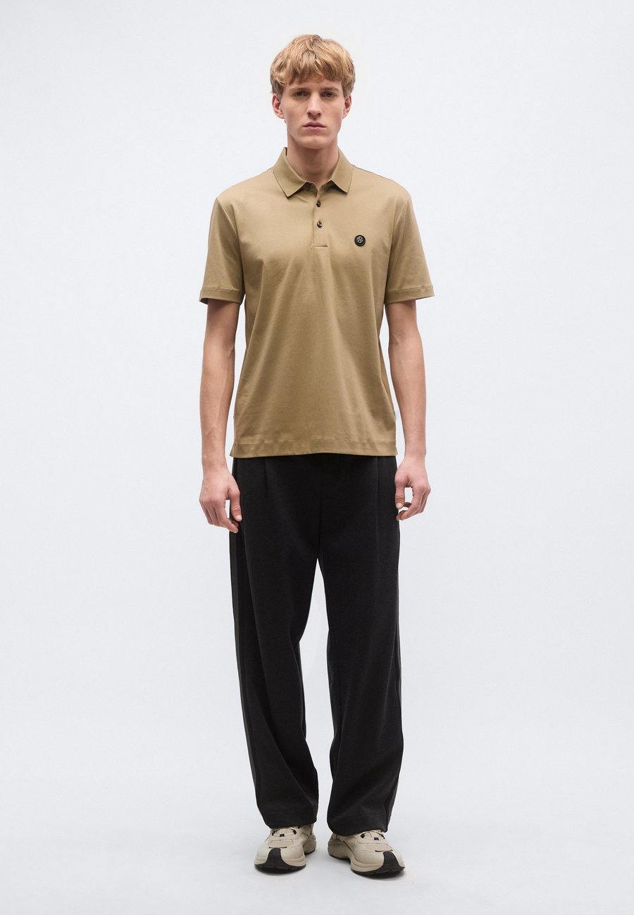 Небольшая этикетка-флажок на уровне груди, кожаные детали. Воротник: рубашка поло.Материал и уход