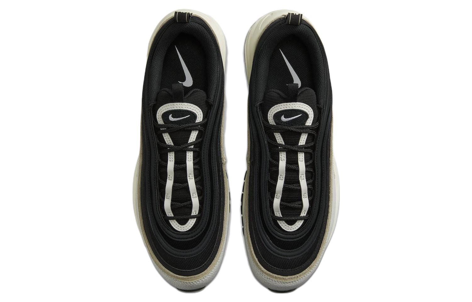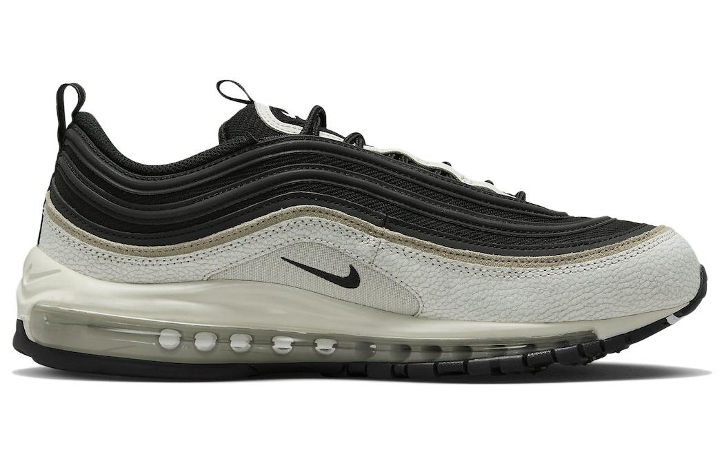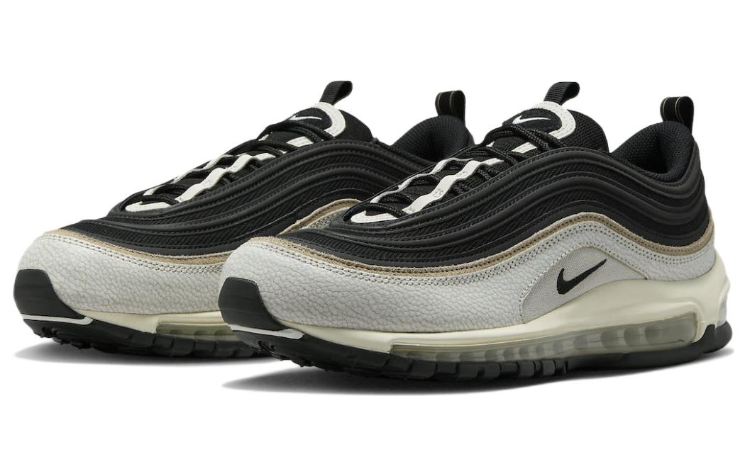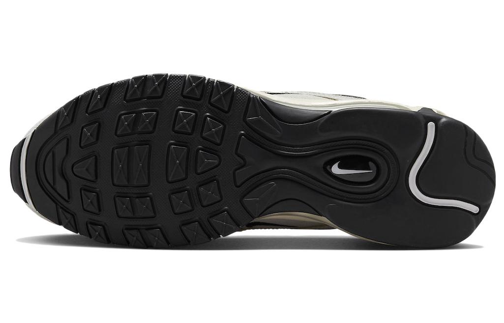 Эти кроссовки Nike Air Max 97 имеют чёрную сетчатую подошву со светоотражающими накладками 3M и защитную накладку из кожи с трещинами в форме слона. Культовые вышитые мини-свуши на промежуточной подошве Sail и чёрная резиновая подошва завершают дизайн.