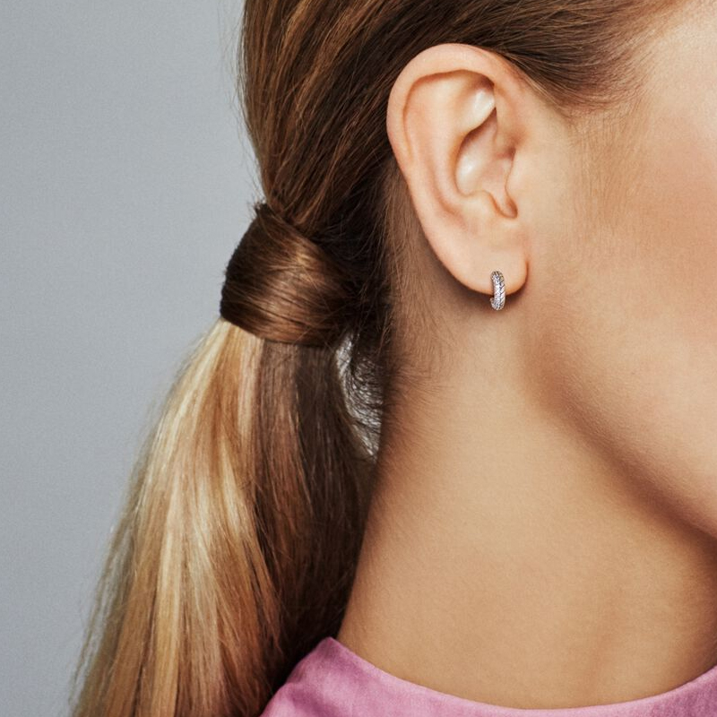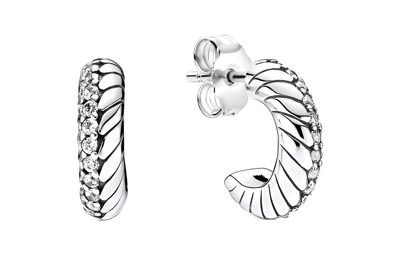 Металл: серебро 925 пробы; Драгоценные камни: 52 бусины из прозрачного кубического циркония круглой огранки; Узор/Форма: Одна сторона серьги украшена паве из драгоценных камней, другая - узором «змейка». Характеристики: Пара серег, два способа ношения: можно носить либо стороной с паве, либо стороной с змейкой. Вдохновение: Классическая текстура браслета-змейки Pandora Moments.
