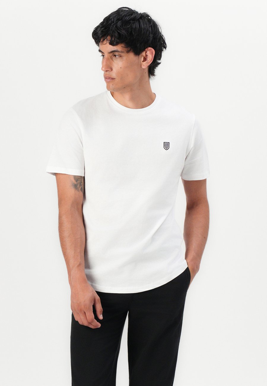 Небольшая этикетка-флажок на уровне груди. Вырез горловины: круглый.Материал и уход