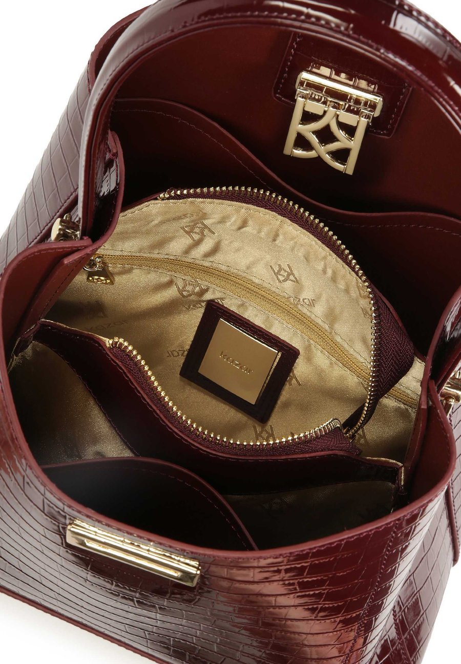Элегантная сумка среднего размера - гармоничное сочетание классики и изысканного дизайна. Изготовленная из лакированной кожи с тонким тиснением, она впечатляет глубоким бордовым оттенком, подчеркивающим ее роскошный характер. Жесткая, стандартная форма с широким дном обеспечивает идеальную организацию внутреннего пространства, а точные детали придают ей неповторимый шик. Модель оснащена как удобной ручкой, так и регулируемым плечевым ремнем, что позволяет носить ее различными способами. Золотистые металлические элементы, включая элегантную застежку в виде монограммы, добавляют сумке эксклюзивности и вневременного очарования. Это идеальный выбор для женщин, ценящих элегантность в современном стиле, идеально подходящий как для особых случаев, так и для классического повседневного образа. Детали изделия: Сумка имеет основное отделение, закрывающееся на металлическую застежку-петлю. Внутри основного отделения находятся 2 открытых отделения и 1 отделение на молнии. На внутренних стенках расположены 3 открытых и 1 закрытый карман. Сумка имеет короткую ручку и съемный регулируемый ремешок. На дне сумки есть металлические ножки. Отделения: Карман для мобильного телефона, просторное внутреннее отделение.Материал и уход