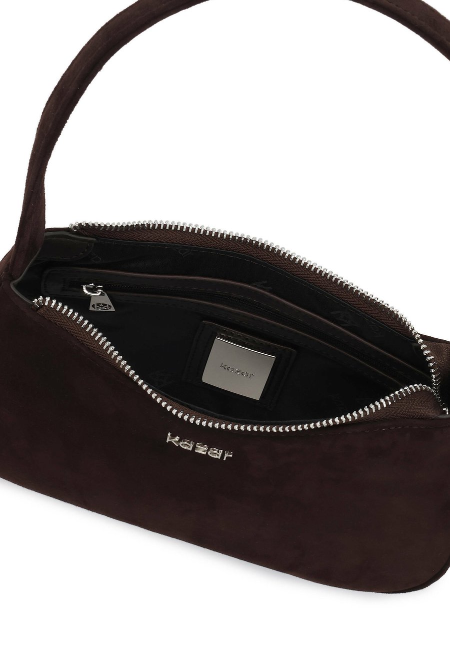 Стильная сумка в форме полумесяца, изготовленная из мягкой замши глубокого коричневого оттенка. Минималистичная форма и плавные линии подчеркивают современный, но вневременной характер модели. Застегивается на серебристую молнию, сумка впечатляет тонким контрастом между матовой отделкой замши и блестящими металлическими акцентами. Оснащенная полужесткой закругленной ручкой, сумка идеально сидит на плече, что делает ее удобной и практичной для повседневного использования. Представленная модель идеально подходит для женщин, которые ценят элегантную простоту, высокое качество исполнения и классические аксессуары в современном исполнении. Детали изделия: Сумка имеет 1 отделение на молнии. Внутри есть 1 карман на молнии и 1 открытый карман. Отделения: Просторное внутреннее отделение, карман для мобильного телефона.Материал и уход