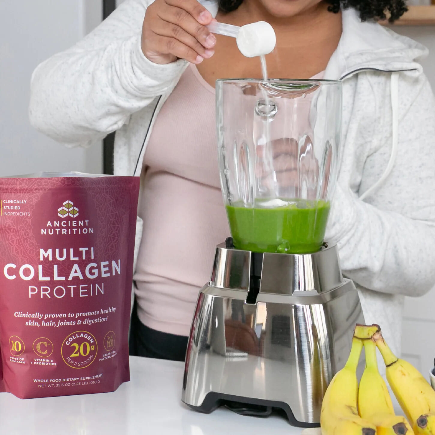 Биологически активная добавка в форме неароматизированного порошка, состоящая из 10 типов коллагена, пробиотиков SBO и витамина С. Клинически изученный ферментированный коллаген мембран яичной скорлупы, обеспечивающий коллаген типов I, II, III, IV, V, VII, VIII, X, XII, XXII поддерживает здоровье суставов, кишечника и кожи. Гидролизованные пептиды рыбного коллагена, который получают из экологически чистых источников минтая, трески и пикши (сига) из вод Северной Америки, естественным образом богаты коллагеном типа I, который участвует в формировании костей, кожи, фасций, связок, сухожилий и кровеносных сосудов. Гидролизованные пептиды бычьего коллагена содержат коллаген типов I и III и обеспечивают поддержку здоровья ногтей, кишечника, суставов и кожи. Клинически изученные пробиотики SBO оказывают дополнительную поддержку для пищеварительной системы. Клинически изученный витамин С обладает мощными антиоксидантными свойствами.