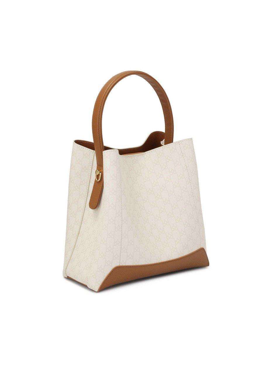 Необычная кожаная сумка - настоящая жемчужина в мире модных аксессуаров. Ее уникальный дизайн сочетает в себе элегантность и современный характер. Светло-коричневый цвет, контрастирующий с белым с едва заметным фирменным принтом, придает сумке изысканность и эксклюзивность. Все это дополняют металлические золотые элементы. Центральным элементом сумки является элегантная застежка в форме монограммы, которая не только выполняет практическую функцию, но и служит украшением и символом бренда. Внутреннее пространство сумки, несмотря на компактность, функционально, с карманами для мелких предметов и достаточным местом для необходимых вещей. Описание товара: Сумка имеет основное отделение, закрывающееся на металлическую шарнирную застежку. Внутри основного отделения находятся 2 открытых отделения и 1 отделение на молнии. В открытых отделениях расположены 2 открытых кармана, а в отделении на молнии - 1 открытый карман и 1 карман на молнии. Сумка имеет короткую ручку и съемный регулируемый ремень. На дне сумки есть металлические ножки. Отделения: Карман для мобильного телефонаМатериал и уход