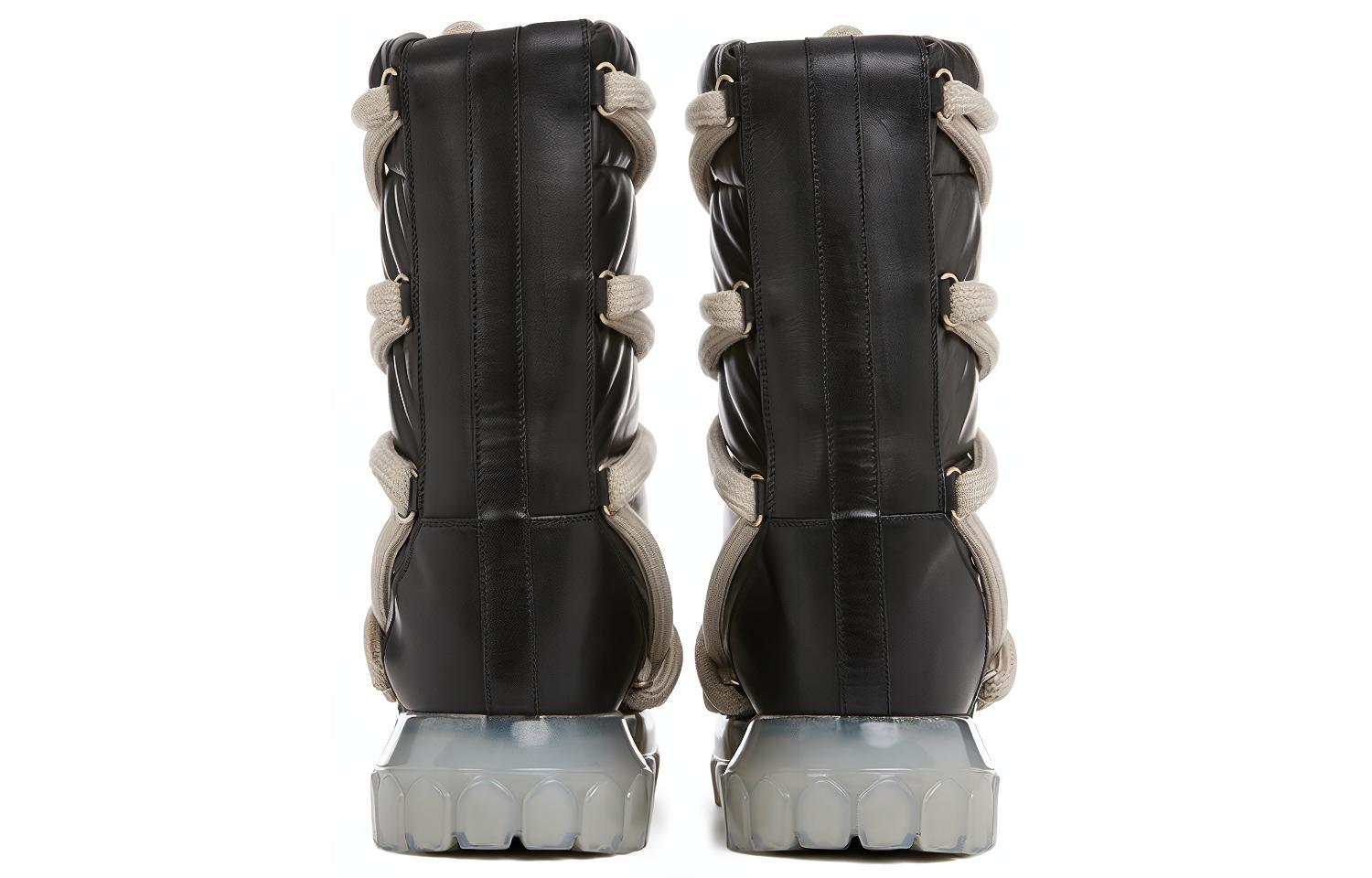 Эти кроссовки LUNAR TRACTORs высотой выше щиколотки отличаются широким мягким верхом с горизонтальной строчкой, геометрическим каблуком и тракторной подошвой. Эта версия из овчины украшена гигантским кружевом с перекрещивающимися пятиконечными звёздами.