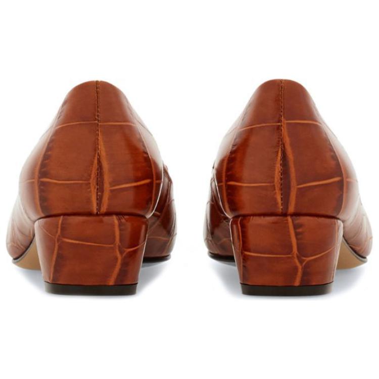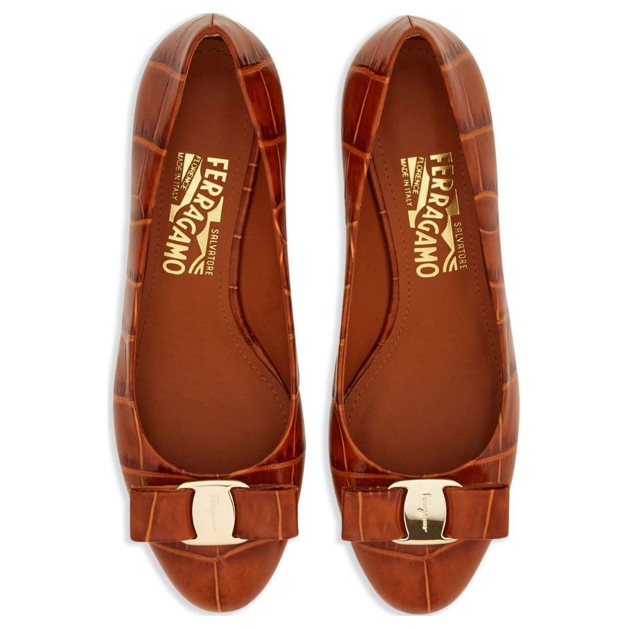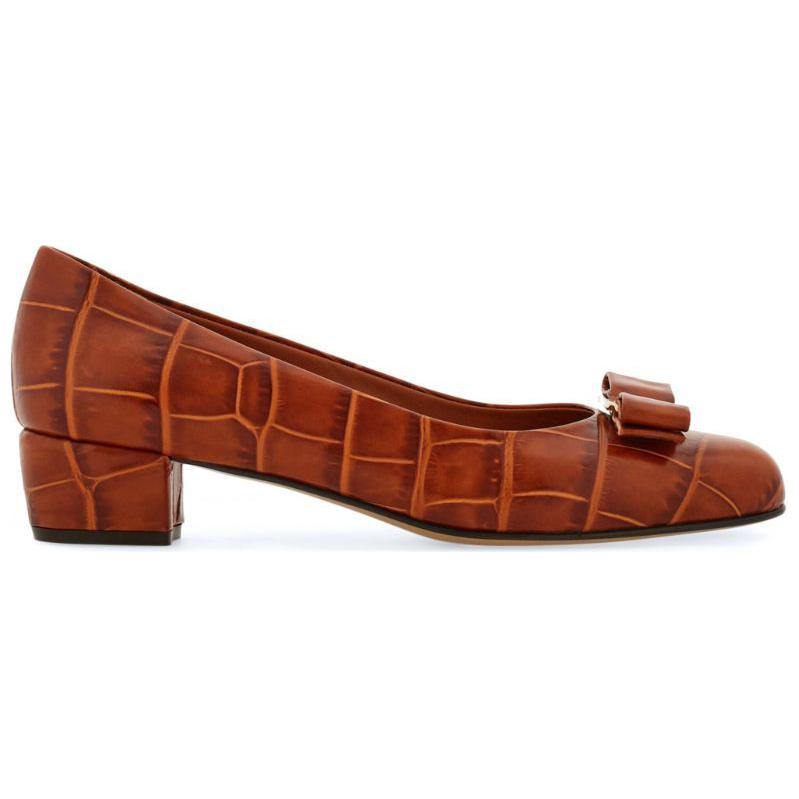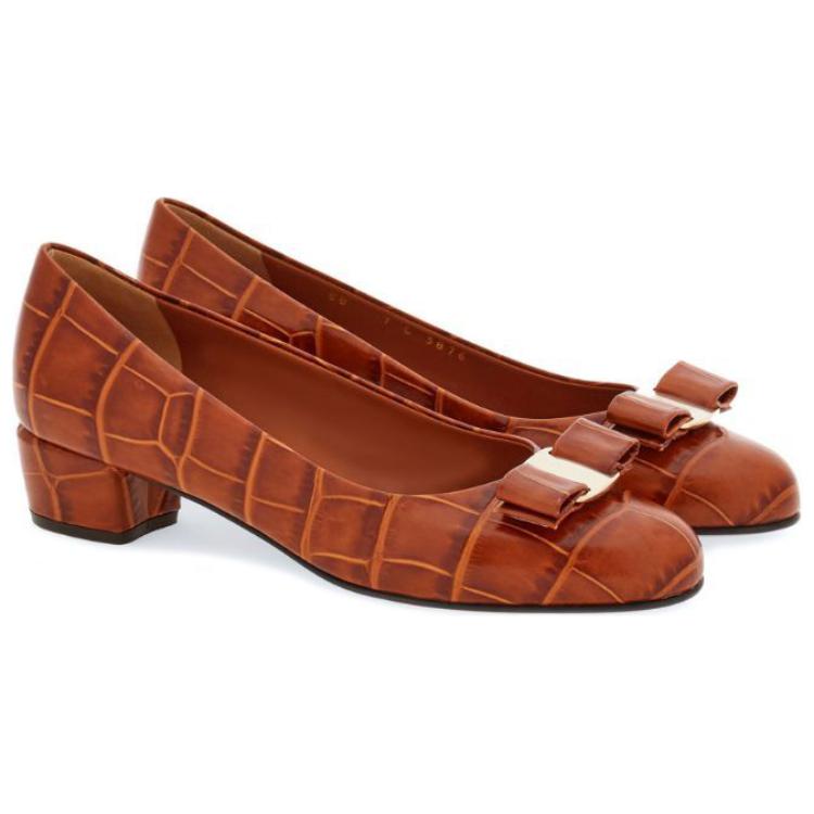 Эти стильные новые туфли на высоком каблуке изготовлены из телячьей кожи с тиснением под крокодила, что добавляет им уникальности. Классический дизайн Ferragamo, эти туфли отличаются закругленным носком и пяткой с укрепленной пяткой для дополнительной прочности. Бант Vara на носке застегивается на фирменную пряжку, а массивный обхватывающий каблук обеспечивает идеальную высоту.