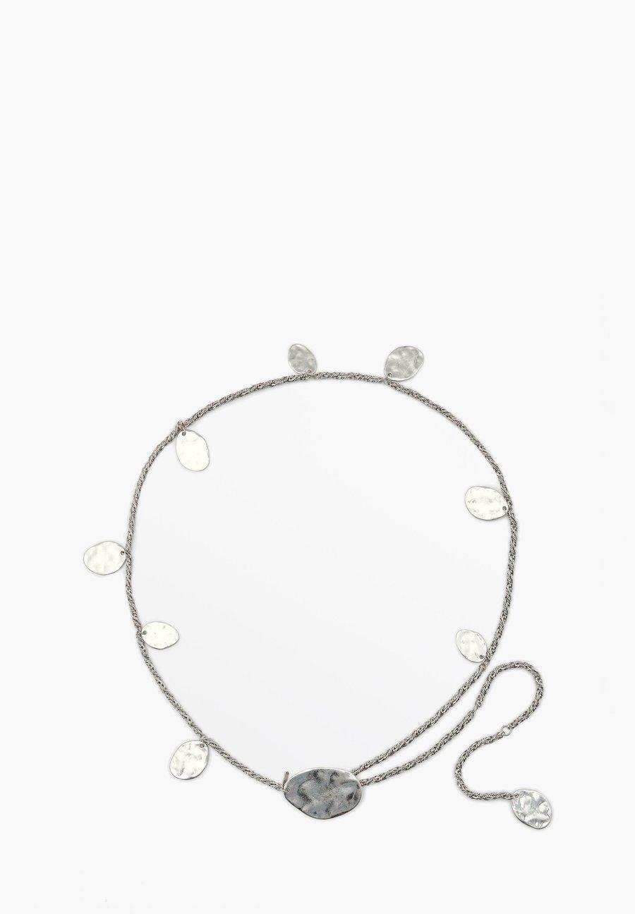 Общая длина: 110 см. Плетеный металлический пояс. Металлические подвески с нерегулярным рисунком в виде монет. Застежка-крючок. Узор: Однотонный.Материал и уход