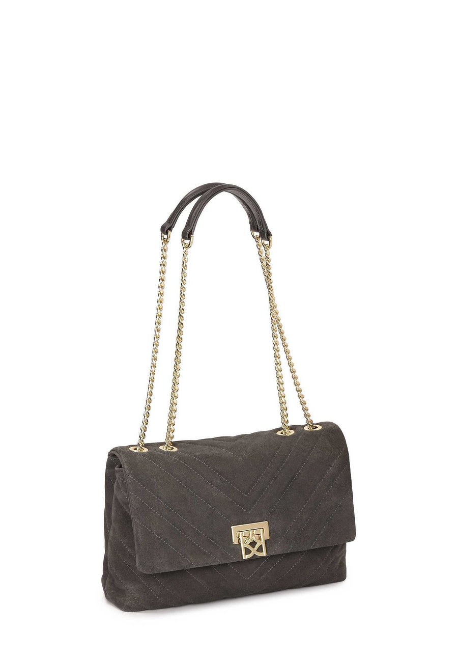 Сумка, изготовленная из мягкой замши приглушенного серого оттенка, имеет классический прямоугольный крой с клапаном, украшенным стежкой в елочку, что подчеркивает вневременной характер модели, идеально подходящей как для повседневной, так и для вечерней одежды. Двойные золотые цепочки служат ручками и позволяют удобно носить сумку как на плече, так и в руке. Центральным элементом является элегантная застежка на клапане в виде металлической монограммы. Эта модель создана для женщин, ценящих утонченную элегантность и благородные материалы - идеальный выбор на каждый день, для работы или для вечернего выхода. Характеристики: Сумка имеет 1 отделение, закрывающееся клапаном на шарнире. Внутри 3 отделения, включая 1 на молнии. Внутри сумки 1 карман на молнии и 1 открытый карман. Цепочка имеет кожаную вставку для комфорта при использовании. Отделения: Карман для мобильного телефона, просторное внутреннее отделение.Материал и уход