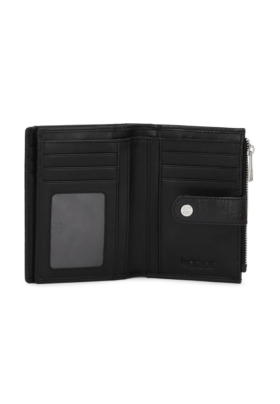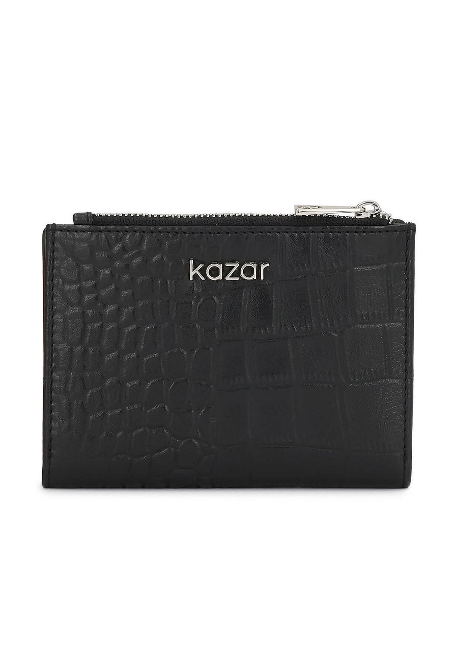 Уникальный кошелек классического черного цвета, изготовленный из высококачественной натуральной кожи с тиснением, имитирующим крокодиловую кожу. Элегантный, но практичный дизайн сочетает в себе роскошный внешний вид и повседневную функциональность. На лицевой стороне расположен декоративный ремешок на кнопке с металлическим логотипом KAZAR, подчеркивающий его престижный характер. Внутреннее пространство кошелька разработано с учетом удобства: многочисленные отделения для карт, карман с окошком для документов, место для банкнот и двухсекционное отделение для монет на молнии. Благодаря компактной форме он легко помещается в кошелек, сохраняя при этом всю функциональность. Отделения: отделение для монетМатериал и уход