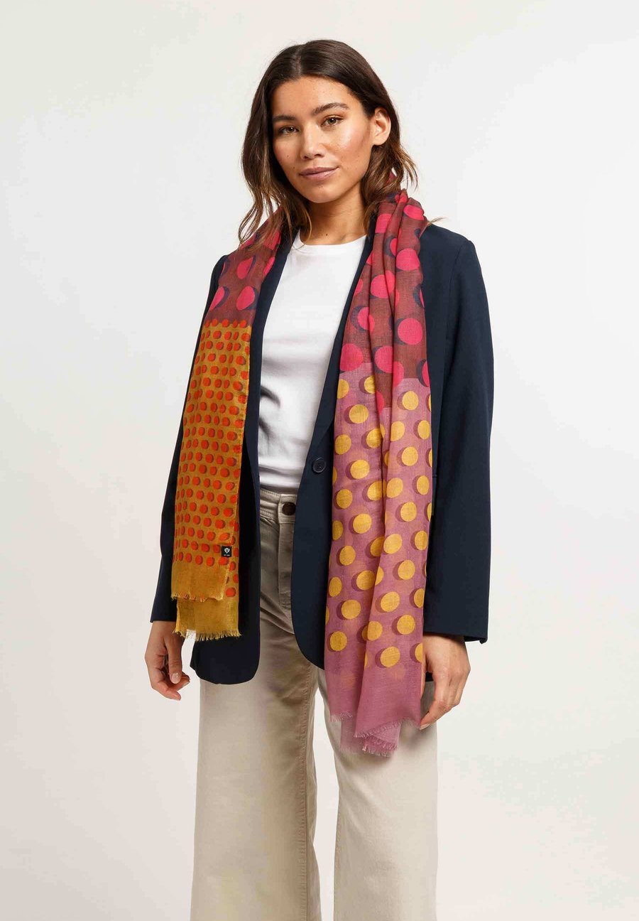 Шаль Устойчивое развитие - в горошек. Эта шаль (70 x 180 см) привлекает внимание своим узором в горошек. Шарф входит в коллекцию FRAAS Устойчивое развитие. Изготовленная из переработанного полиэстера, полученного из использованных ПЭТ-бутылок, она экологична и обеспечивает комфортное ношение. Яркий узор в горошек различных размеров и современное сочетание цветов делают эту шаль настоящим украшением. Идеально подходит для элегантных случаев или повседневной носки - просто накиньте на плечи и выглядите стильно. Узор: в горошекМатериал и уход