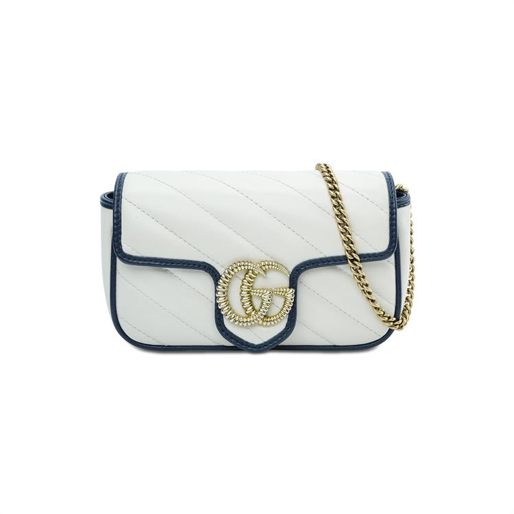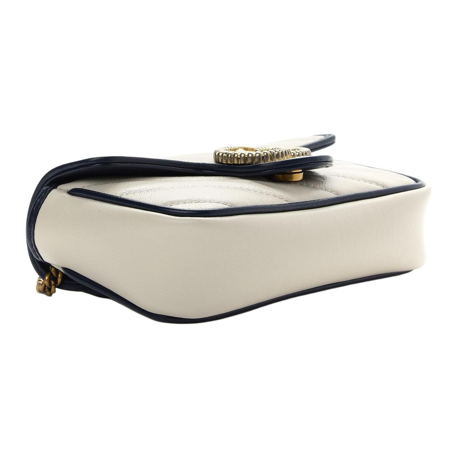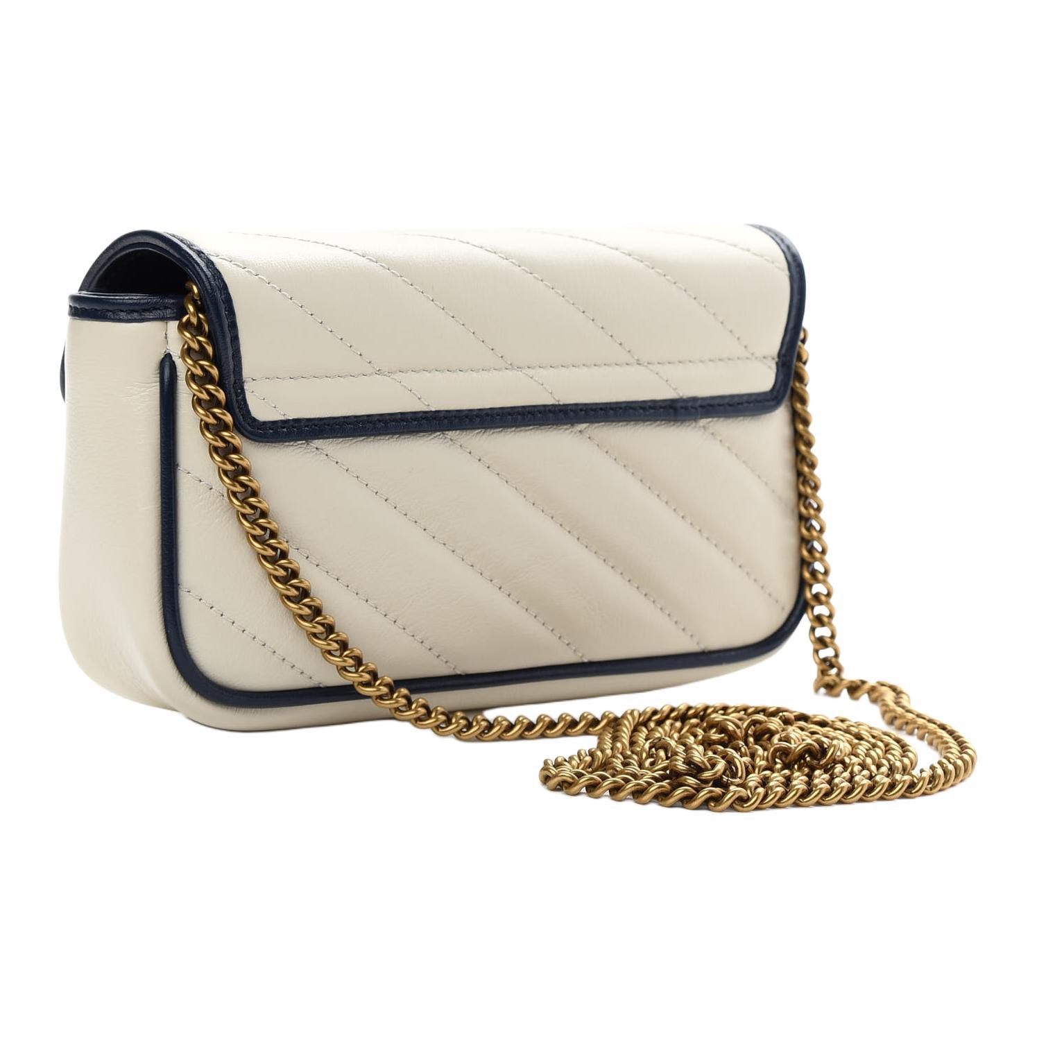 Эта ультраминиатюрная сумочка GG Marmont выполнена из стеганой кожи белого твила с тёмно-синей кожаной окантовкой. Классическая фурнитура в виде двойной буквы G переосмыслена с помощью текстурированной отделки, что привносит современную нотку в дизайн 70-х годов и придаёт этой изящной сумочке новую привлекательность.